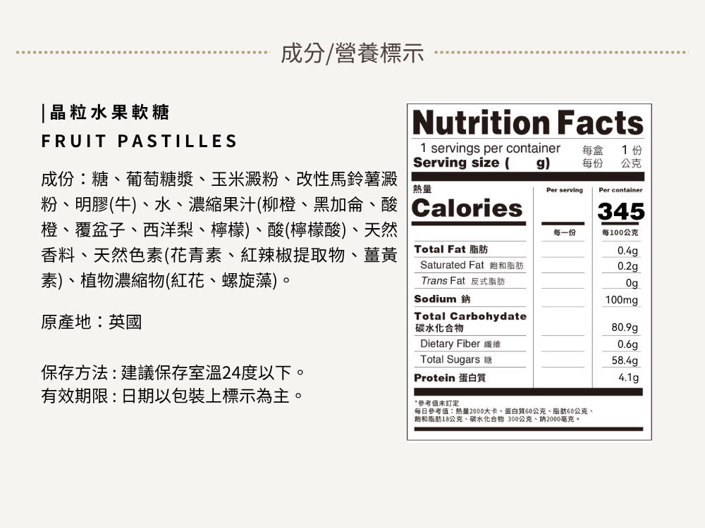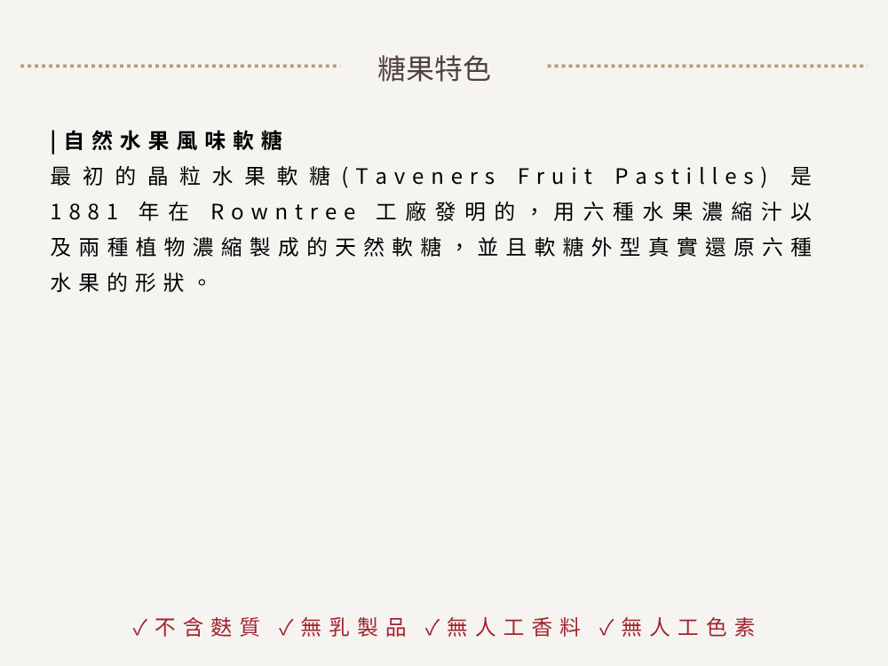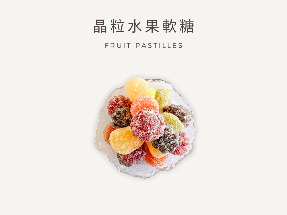 Fruit Pastilles 是來自英國的人氣經典,外層裹上細緻晶亮糖粒,內裡柔軟 Q 彈,入口即散發濃郁果香。每一顆軟糖都蘊含天然果汁風味,像是草莓、黑加侖、柳橙、檸檬與青蘋果等多種水果組合,讓味蕾一次滿足多重果香層次。