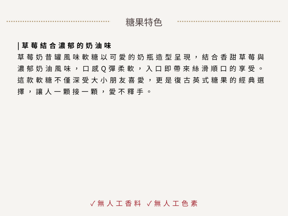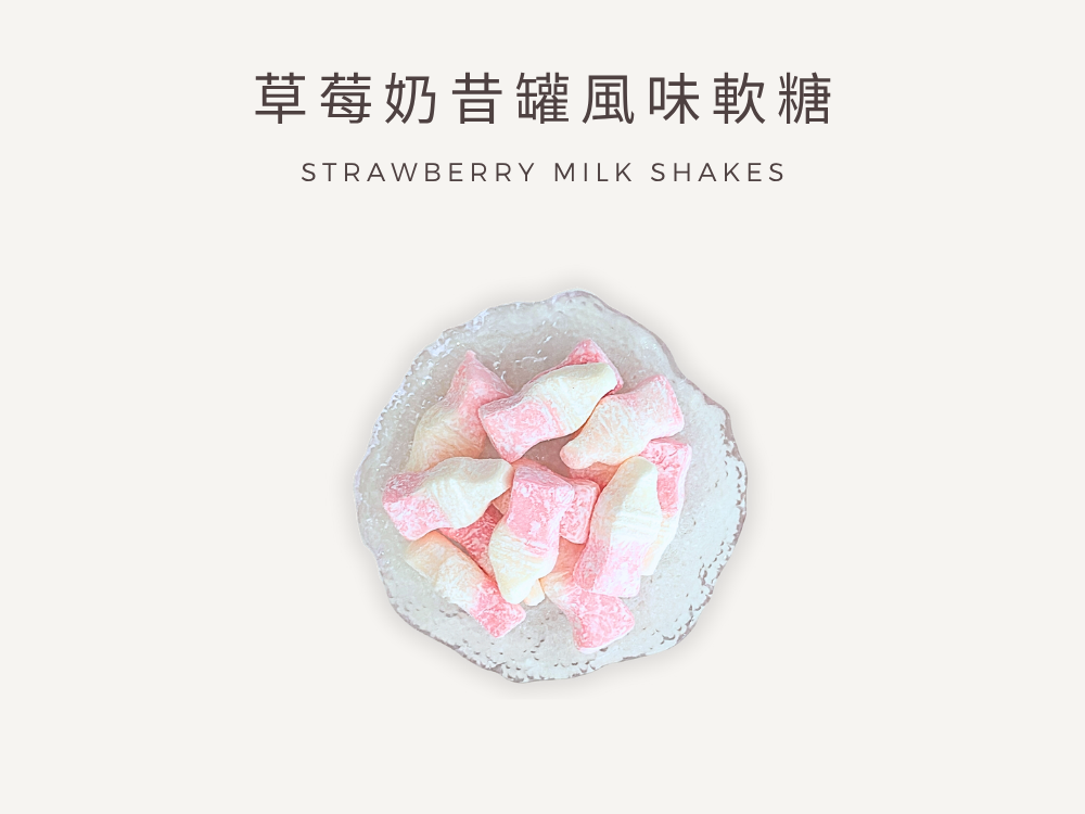 草莓奶昔罐風味軟糖以可愛的奶瓶造型呈現,結合香甜草莓與濃郁奶油風味,口感Q彈柔軟,入口即帶來絲滑順口的享受。