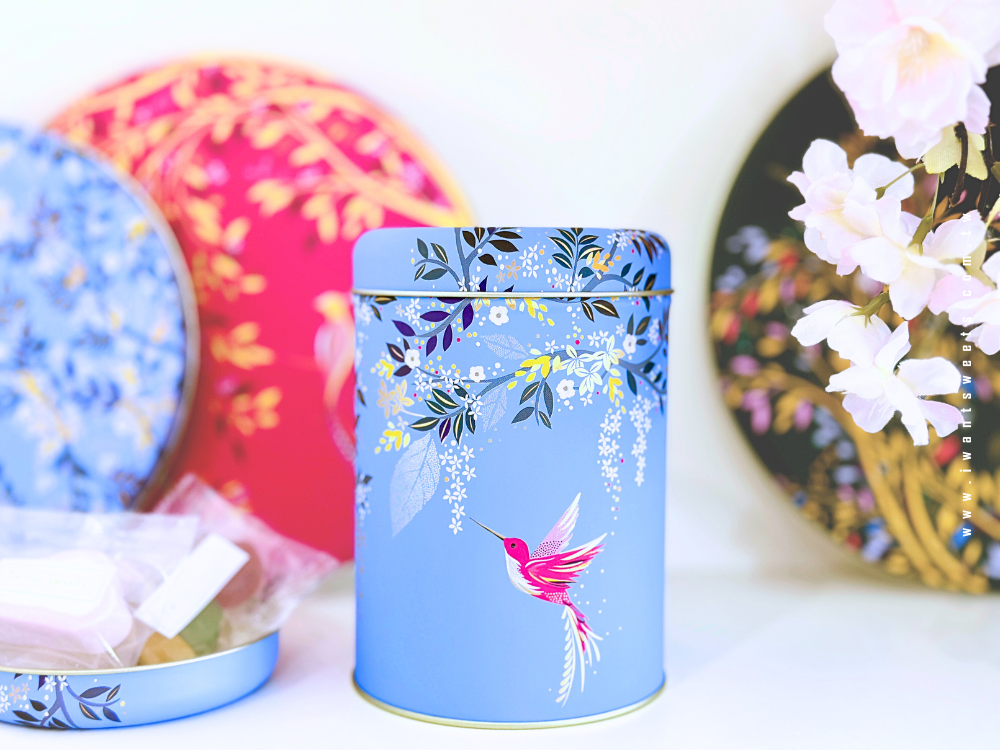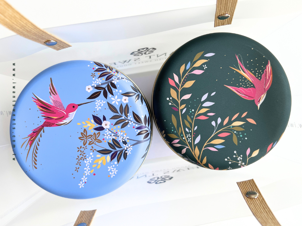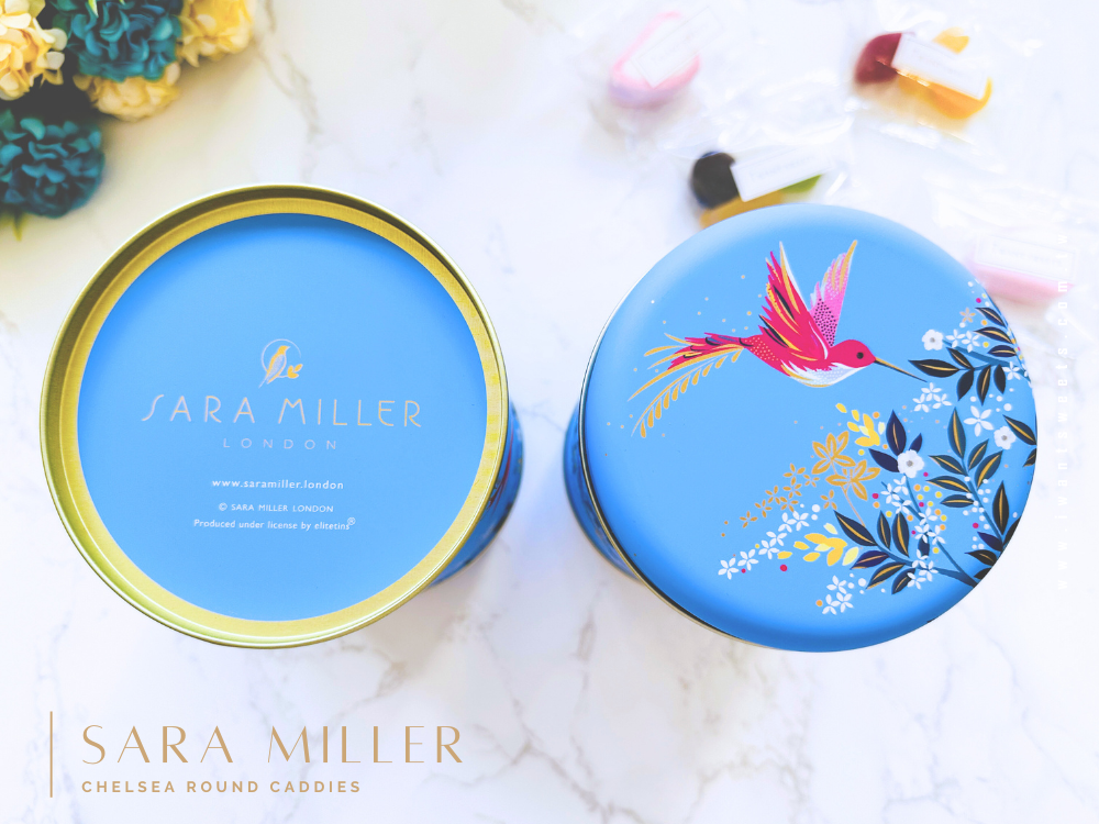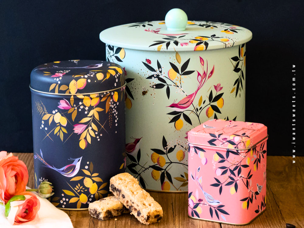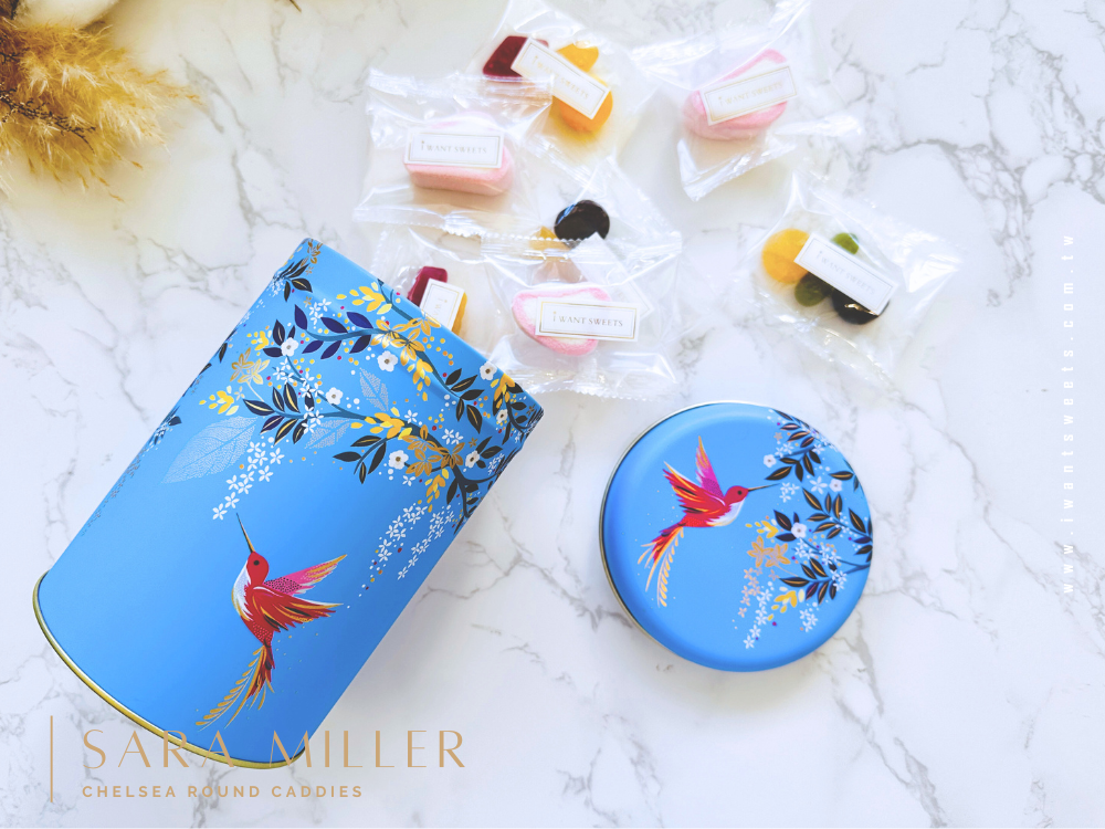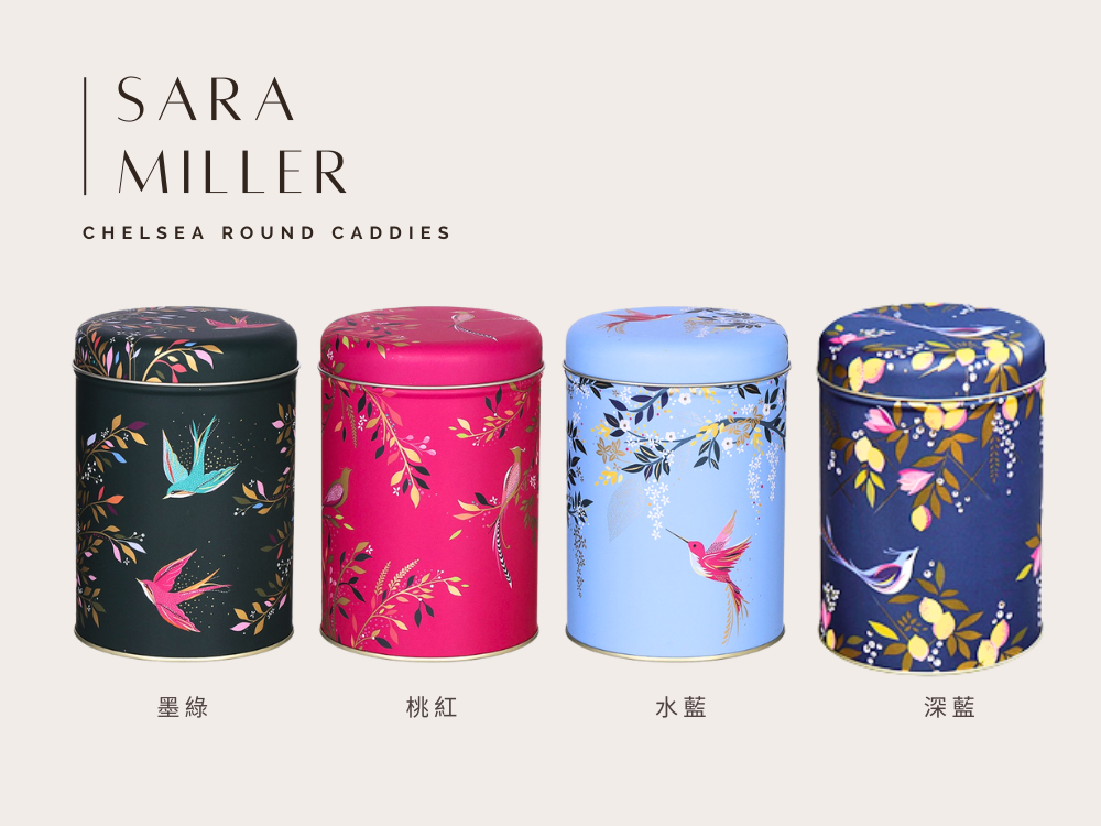 Sara Miller 雀兒喜果園系列糖果圓罐以 Chelsea 系列繽紛果園與花鳥圖樣為設計主題,色彩高貴典雅,圓罐造型實用,內盛英國糖果,甜香迷人。