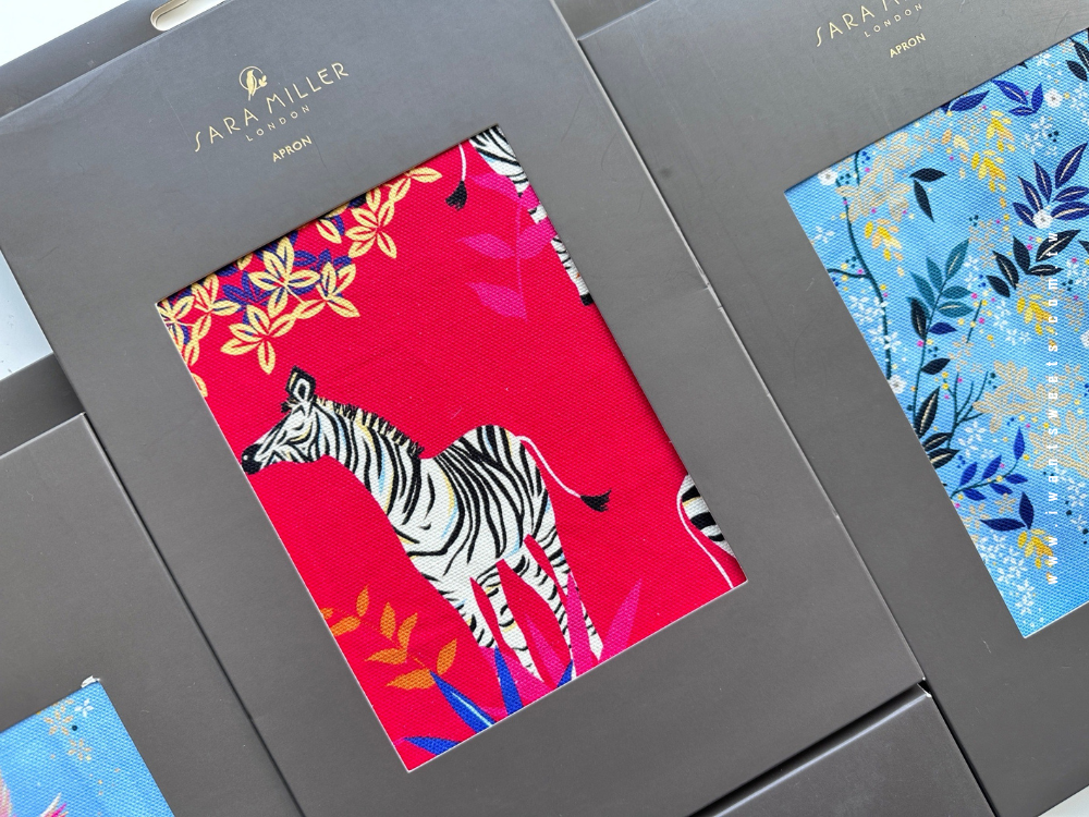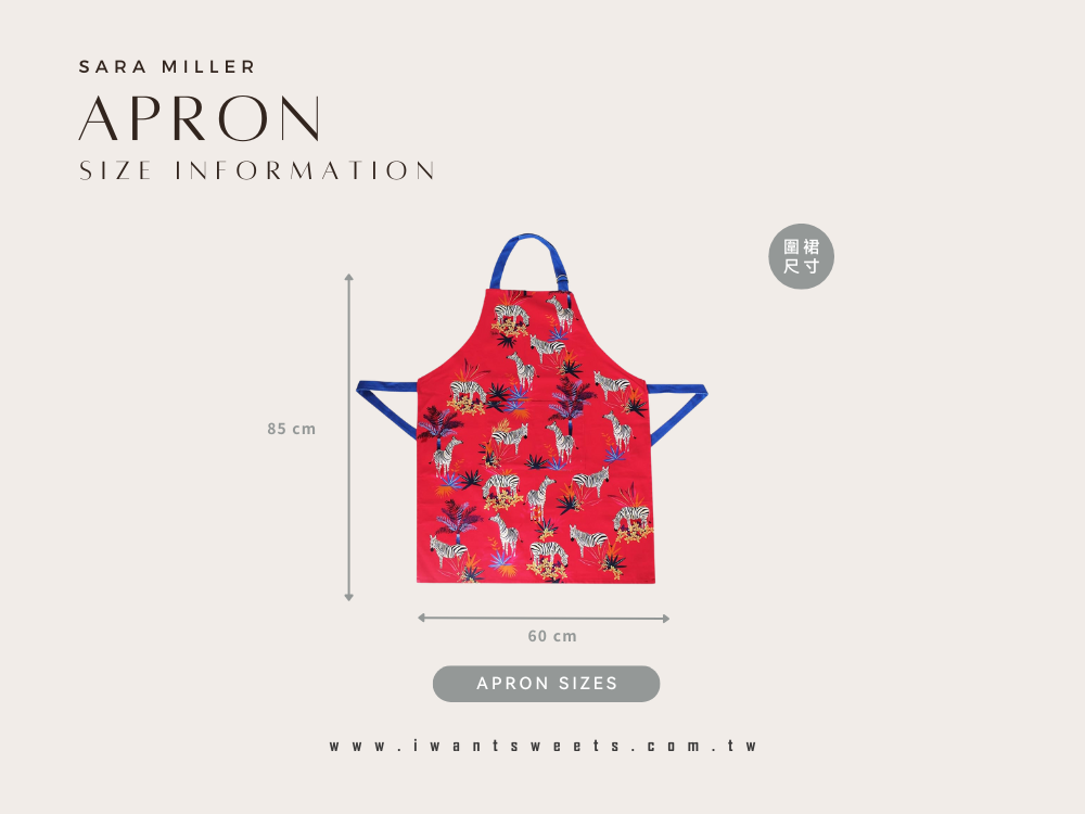 來自英國倫敦設計品牌 Sara Miller London,這款圍裙以經典斑馬圖騰為主角,搭配深綠叢林背景與金箔細節,呈現出充滿節奏感的異國美學。野性與優雅並存,是 Sara Miller 系列中最具個性的代表作之一。