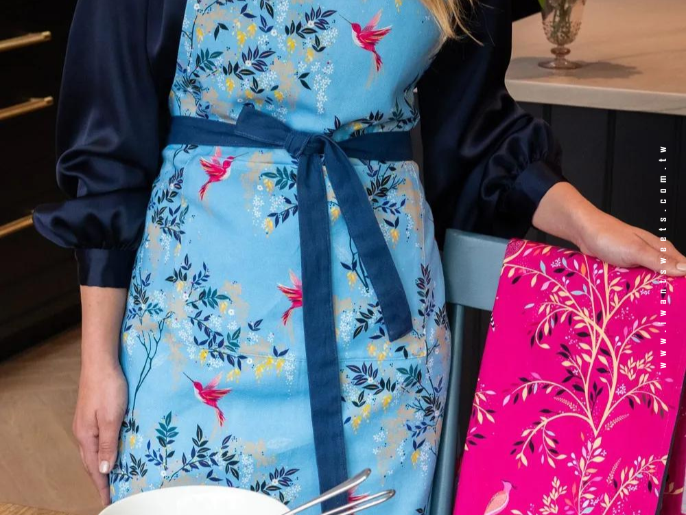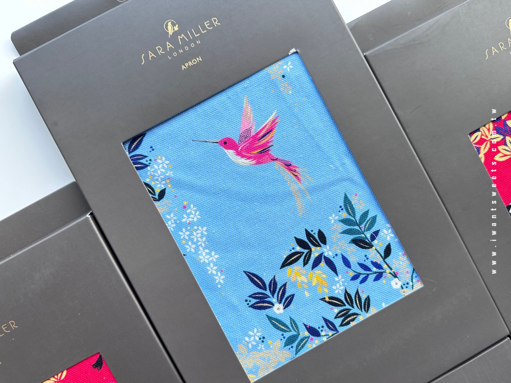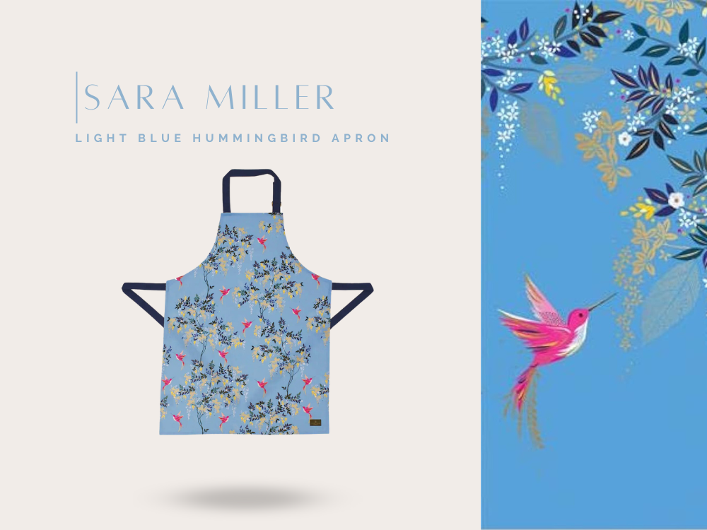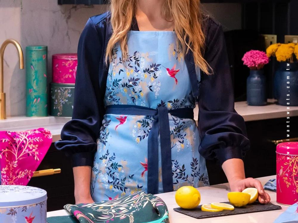 這款由英國設計師品牌 Sara Miller London 出品的廚房圍裙,以招牌風格的蜂鳥與繁花為主題,印製於夢幻般的粉霧藍底色上,搭配金箔細節點綴,展現品牌一貫的優雅與華麗。