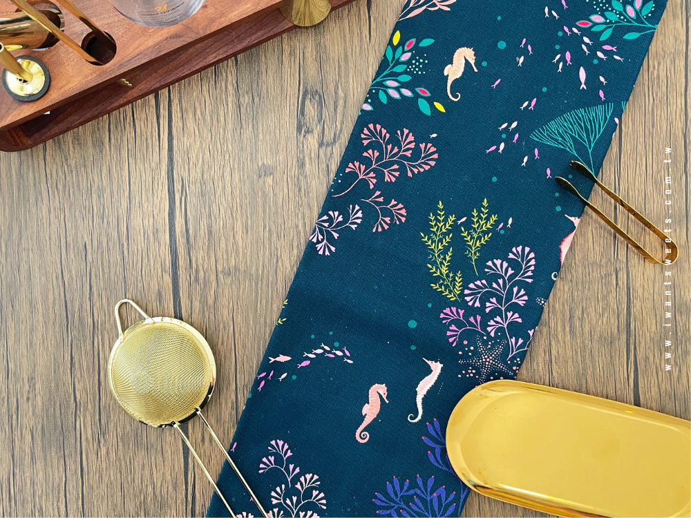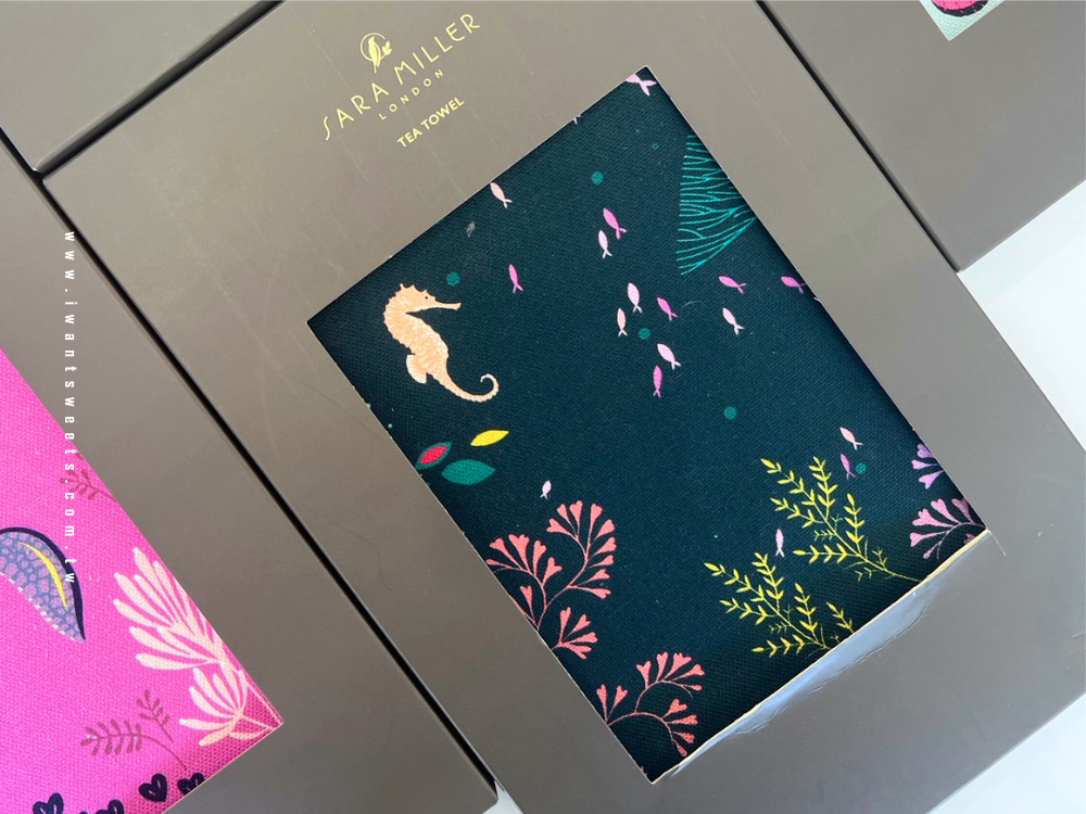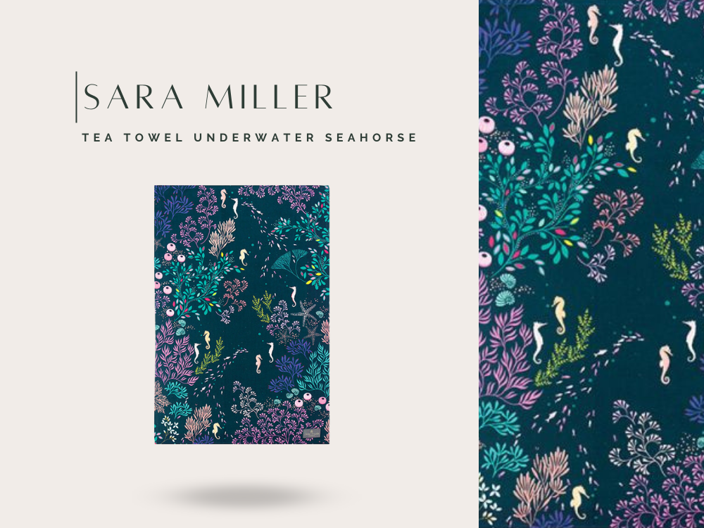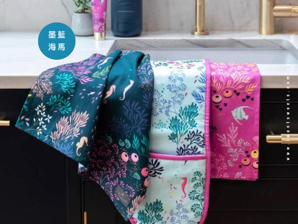以深邃墨藍為背景,描繪優雅海馬悠游於海藻之間的靜謐畫面,搭配金箔細節點綴,展現 Sara Miller 品牌一貫的異國美學與細膩工藝。色彩沉穩中帶有夢幻氣息,為日常廚房增添藝術氛圍。