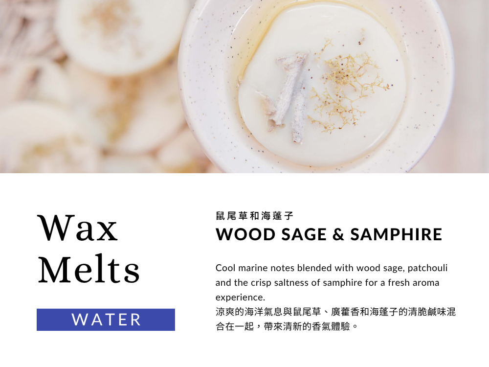 來自英國香氛品牌 Elements 的水元素蠟融餅,融合鼠尾草的溫潤草香與**海蓬子(samphire)**的鹽感清新,仿若沿海潮濕空氣中夾帶著野草與浪花的氣息。