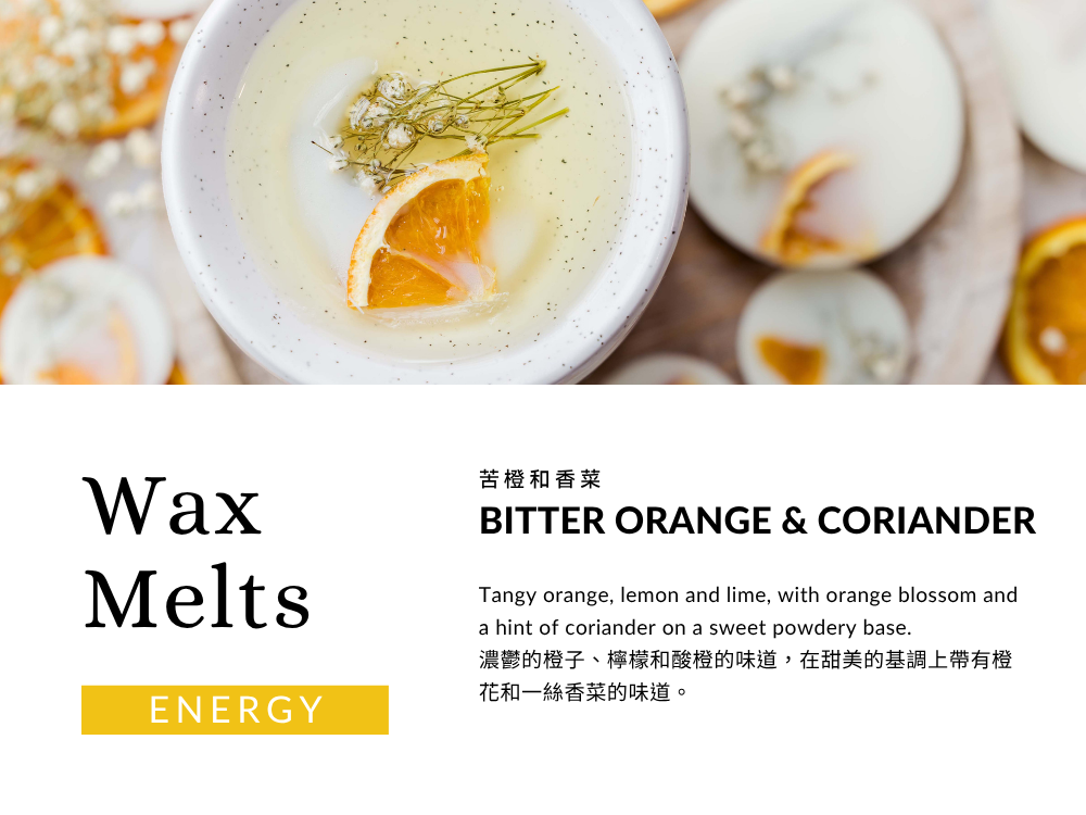 靈感來自自然界中流動不息的生命力,「能量」這款蠟融餅以醒神的苦橙香氣為主調,揉合辛香清爽的香菜籽精油,帶來層次分明的活力感受。