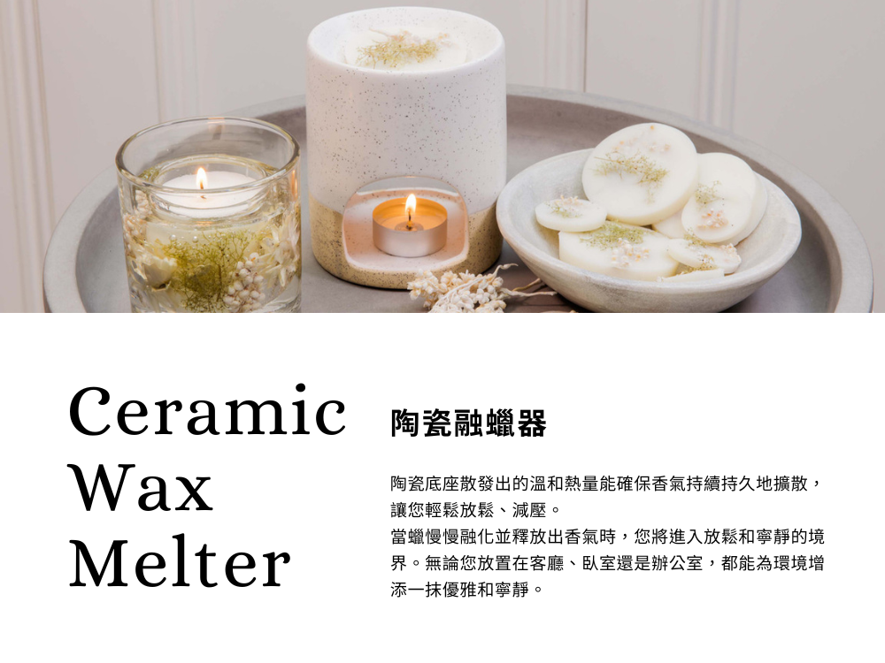 陶瓷融蠟器,簡約而富質感的外觀,專為融化植物系蠟融餅而設。使用小蠟燭加熱,讓香氣隨著溫度自然擴散,營造安心而舒緩的空間氛圍。