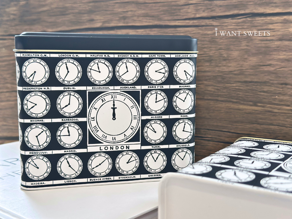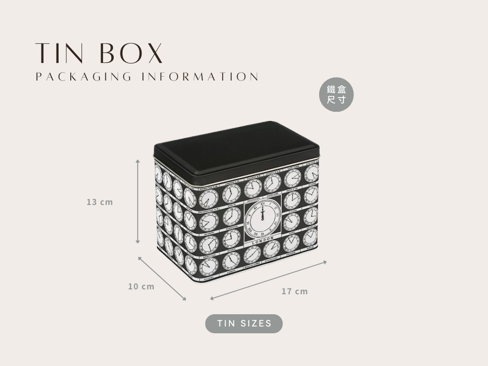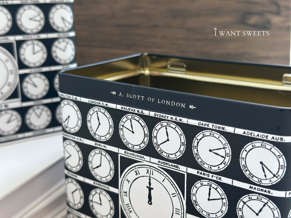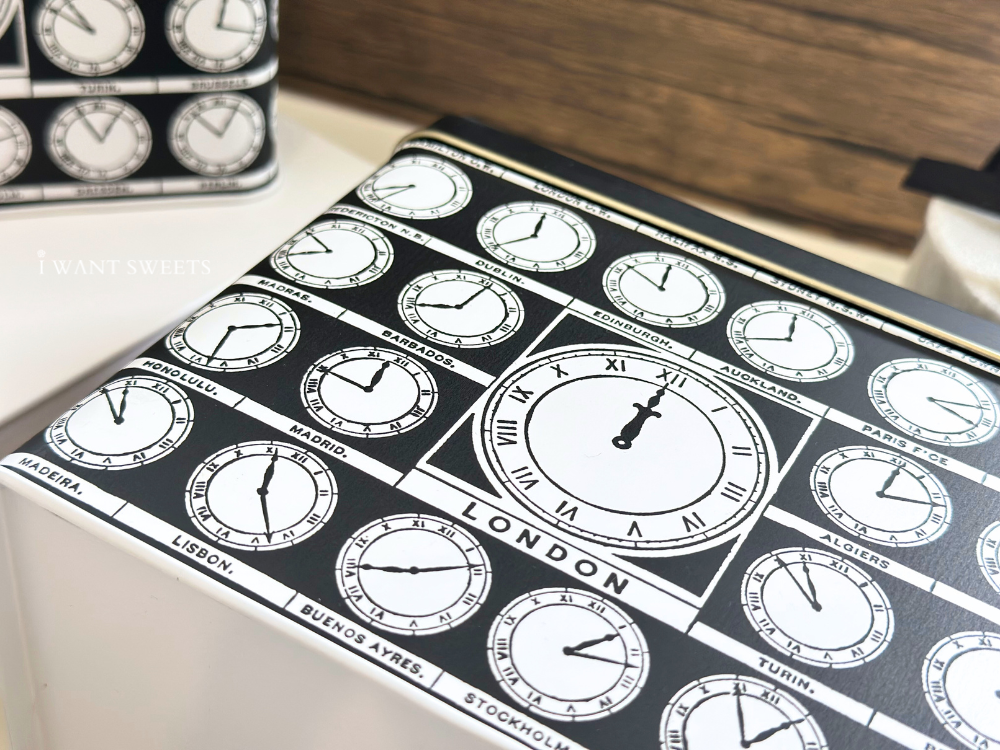 「World Clocks Tea Caddy」以經典時鐘面盤為主題,鐵盒設計環繞著多時區刻度與金色指針,營造出旅人視角的時間美學。滑動金屬蓋輕揭即見盒身精緻細節,雅緻卻帶趣味,彷彿訴說著時光在世界各地悄悄流轉的故事。
