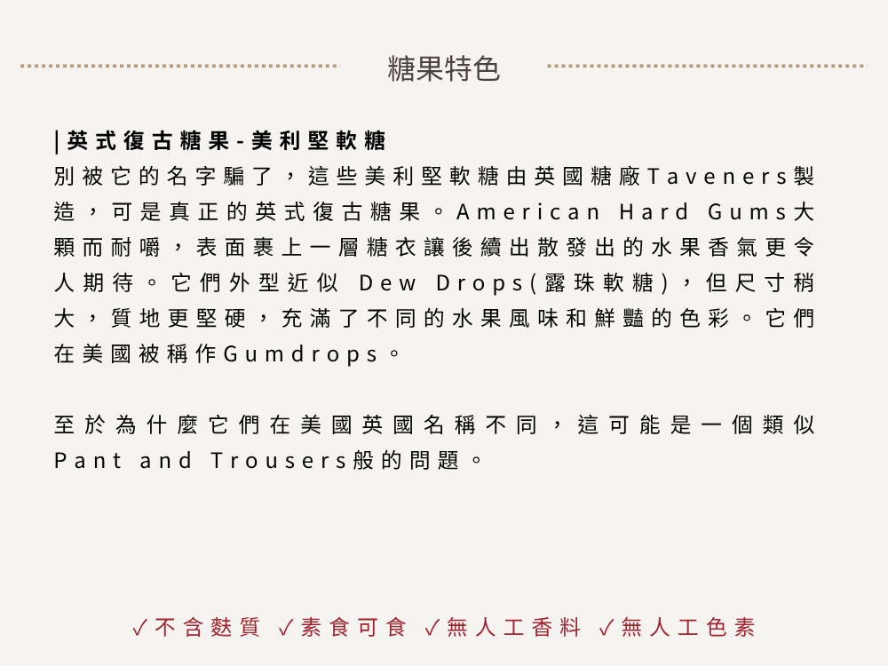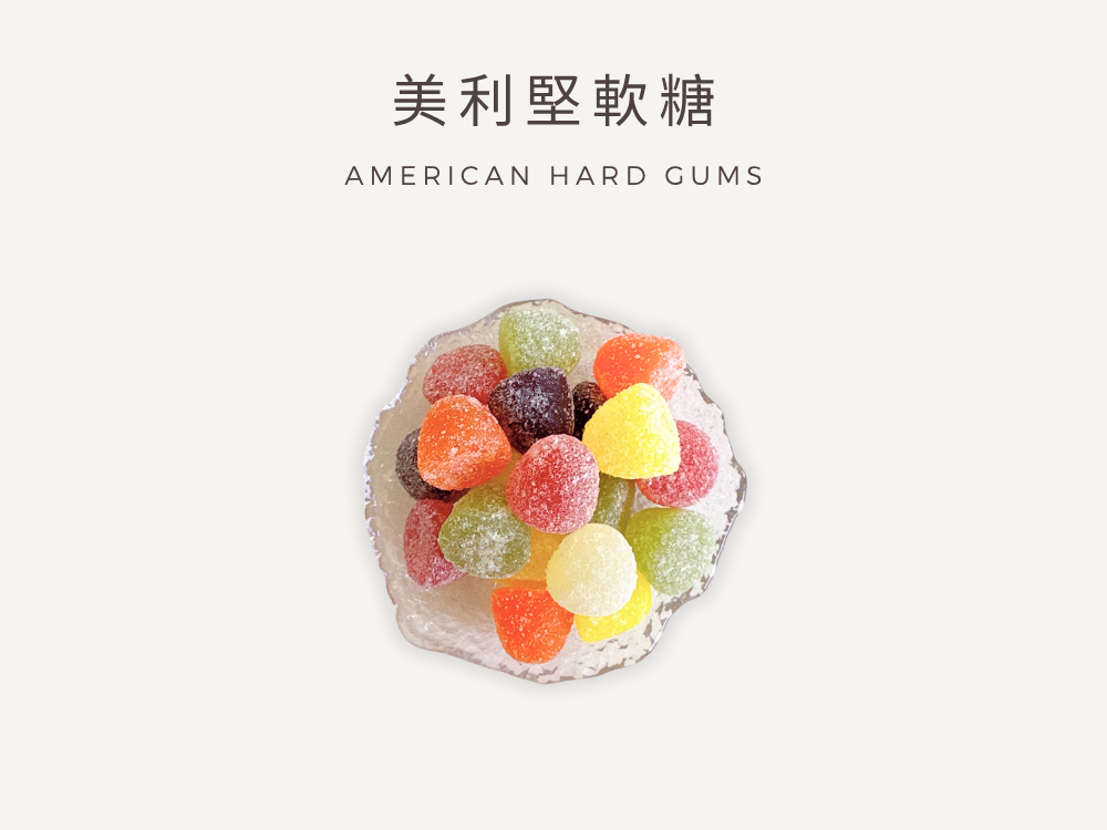 American Hard Gums 是一款結合美式風格與傳統果味的經典糖果,以飽滿色彩和扎實咬感為特色,深受各年齡層喜愛。圓潤飽滿的外型裹上細糖粉,口感 Q 彈有嚼勁,不黏牙、不死甜,是咀嚼系糖果控的夢幻選擇。