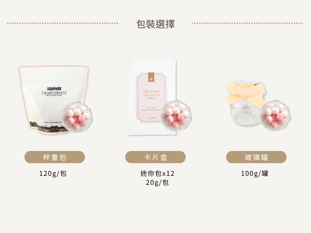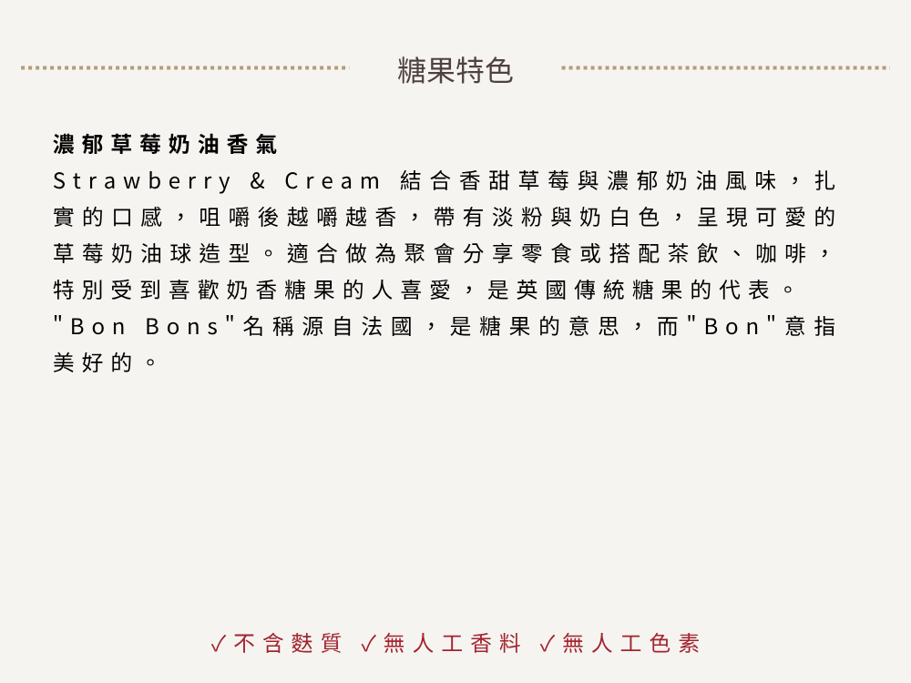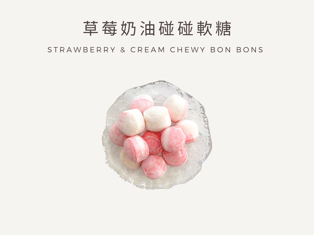 Strawberry & Cream 結合香甜草莓與濃郁奶油風味,扎實的口感,咀嚼後越嚼越香,帶有淡粉與奶白色,呈現可愛的草莓奶油球造型。
