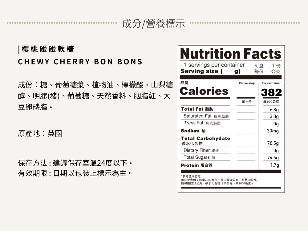 外層裹著細緻的糖粉,第一口咬下時帶有微微脆感,隨即轉化為柔軟的嚼勁。酸甜的櫻桃風味在舌尖綻放,甜而不膩,充滿濃郁的果香。這種「外脆內軟」的層次感,是 Bon Bons 系列最迷人的特色。
