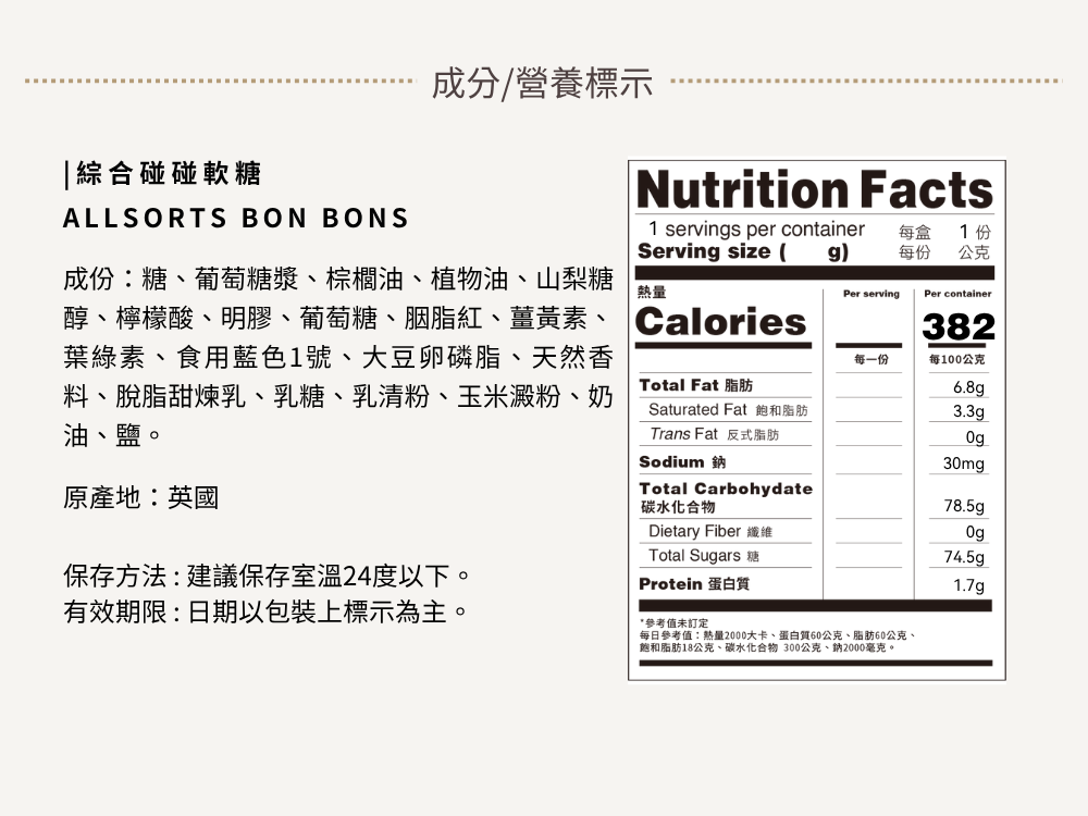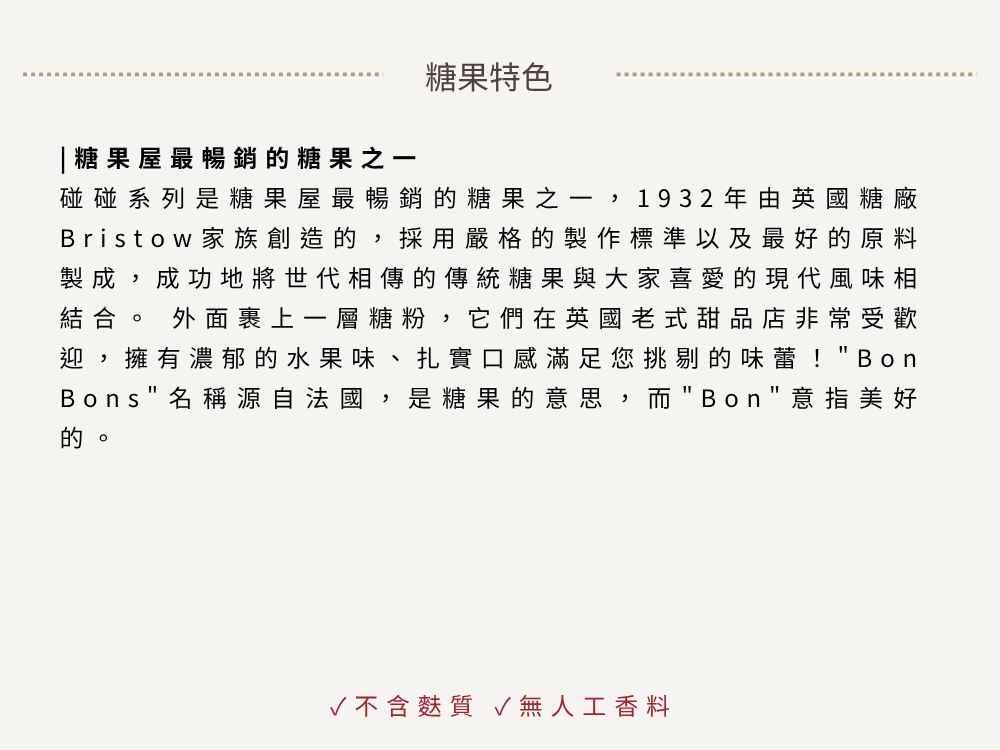 Bon Bons 是歐洲歷史悠久的經典糖果,以圓球狀外型與多層次口感著稱。這款 Allsorts 綜合碰碰軟糖 將多種人氣果味一次網羅,色彩繽紛、香氣濃郁,讓你每一口都有新發現!糖果外層裹有薄薄糖衣,咬下後是紮實又帶嚼勁的Q彈軟糖內心。不黏牙、不死甜,口感厚實,是慢慢咀嚼、細細品味的理想零嘴。Bon Bons 特有的「碰碰咬感」與酸甜風味組合,是英國人從小吃到大的懷舊回憶,也是在派對、電影院、旅行中最受歡迎的糖果之一。