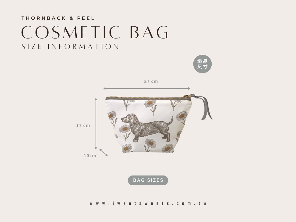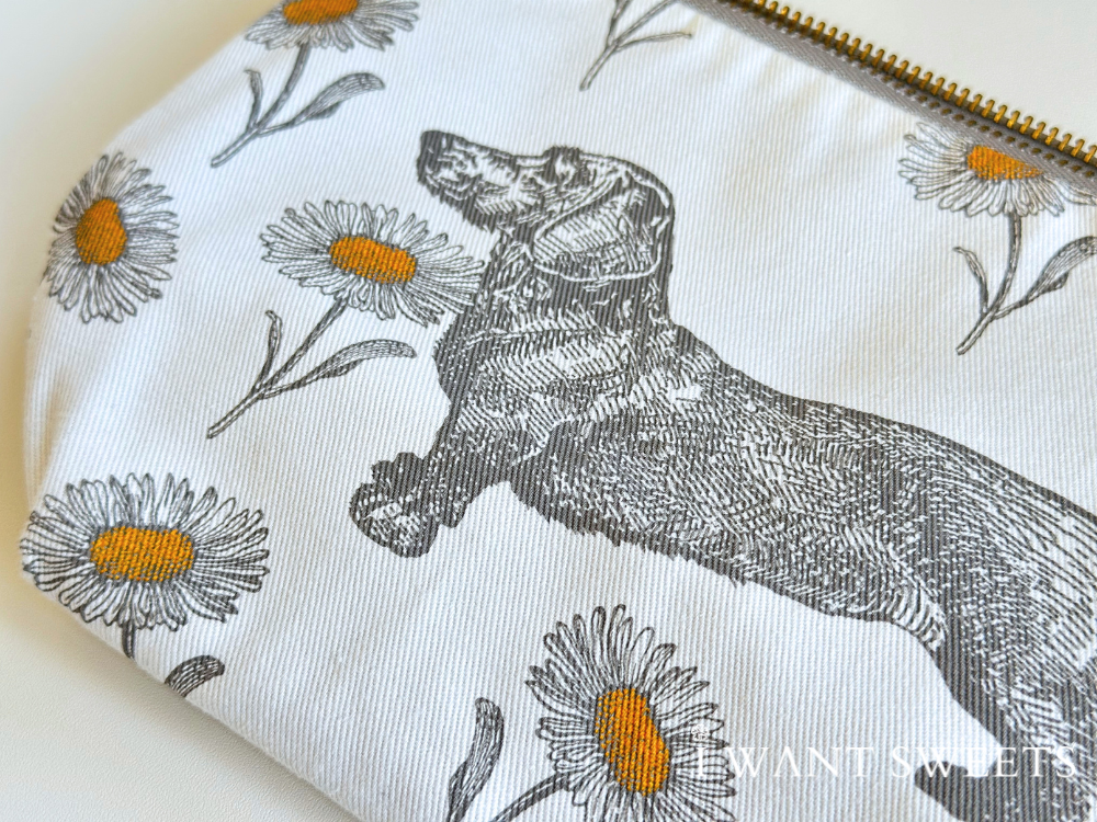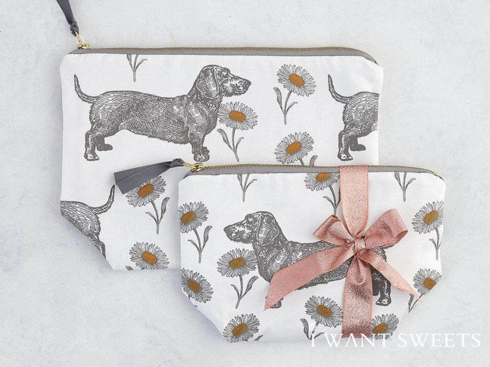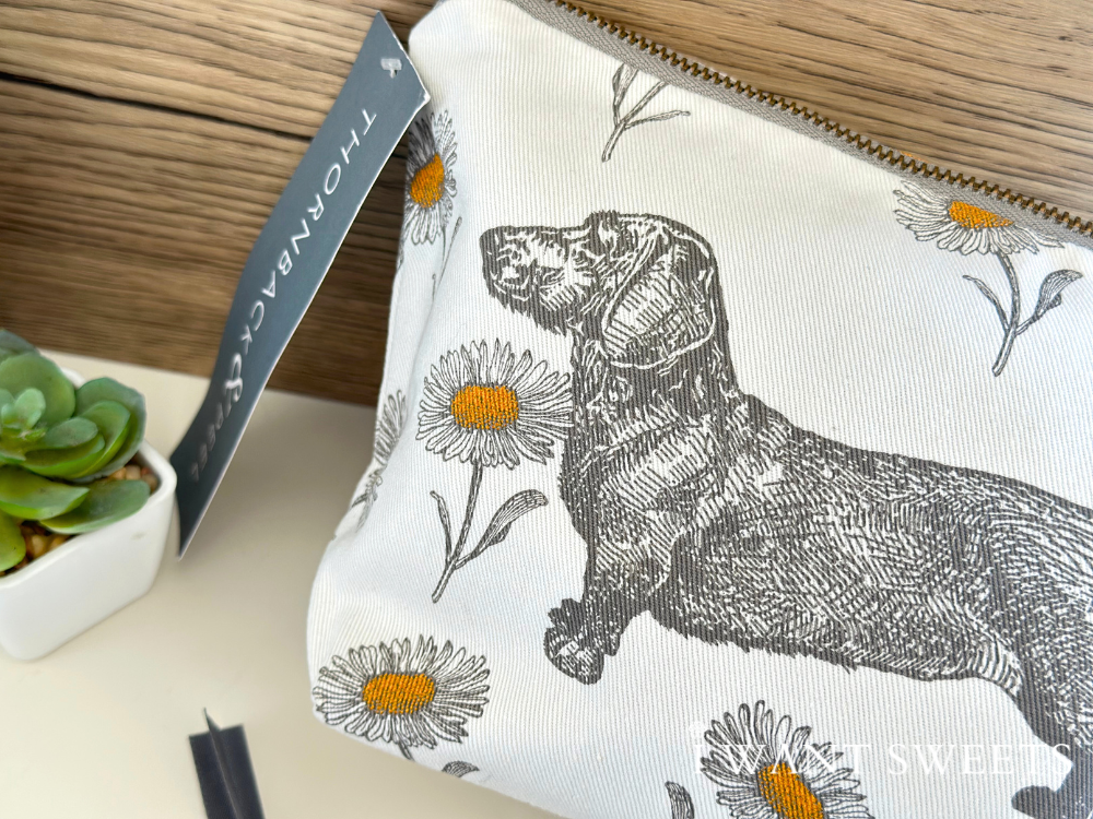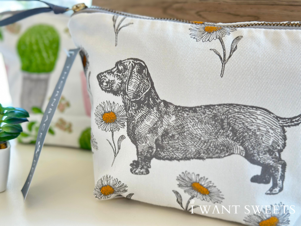 Thornback & Peel 小化妝包 – 雛菊臘腸狗 (Dog & Daisy Cosmetic Bag),結合了英倫幽默與優雅印花設計。