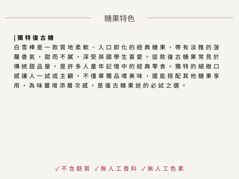 獨特的細緻口感讓人一試成主顧,不僅單獨品嚐美味,還能搭配其他糖果享用,為味蕾增添層次感,是復古糖果迷的必試之選。