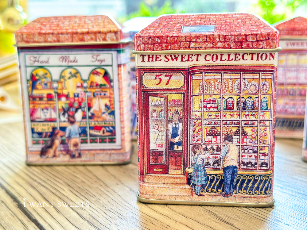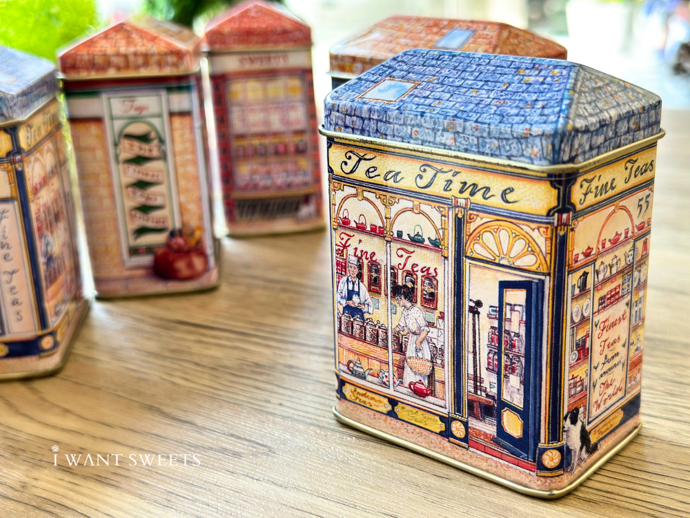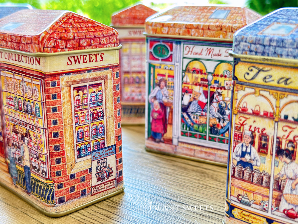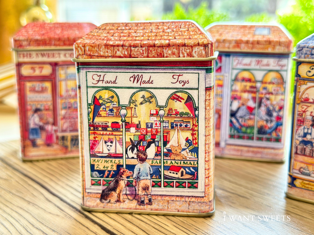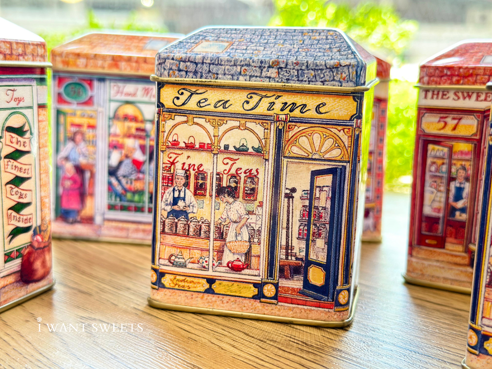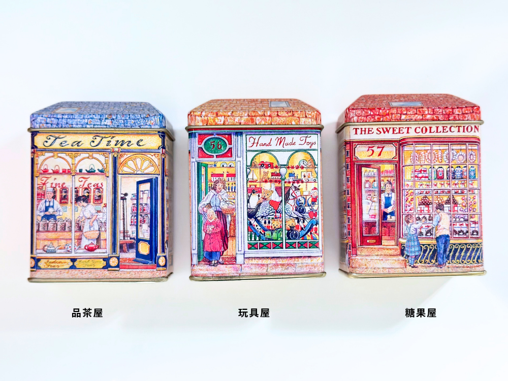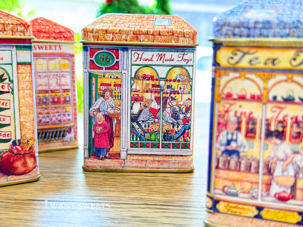 「街角小屋鐵盒 Corner Shop Tins」以英國老街巷的懷舊風景為靈感,細膩描繪茶館、玩具店與糖果鋪的溫馨日常。每一面都如同微縮劇場,透出金色燈光與節慶氛圍,讓人彷彿漫步在聖誕前夕的倫敦街頭,感受復古又暖心的英倫風情。