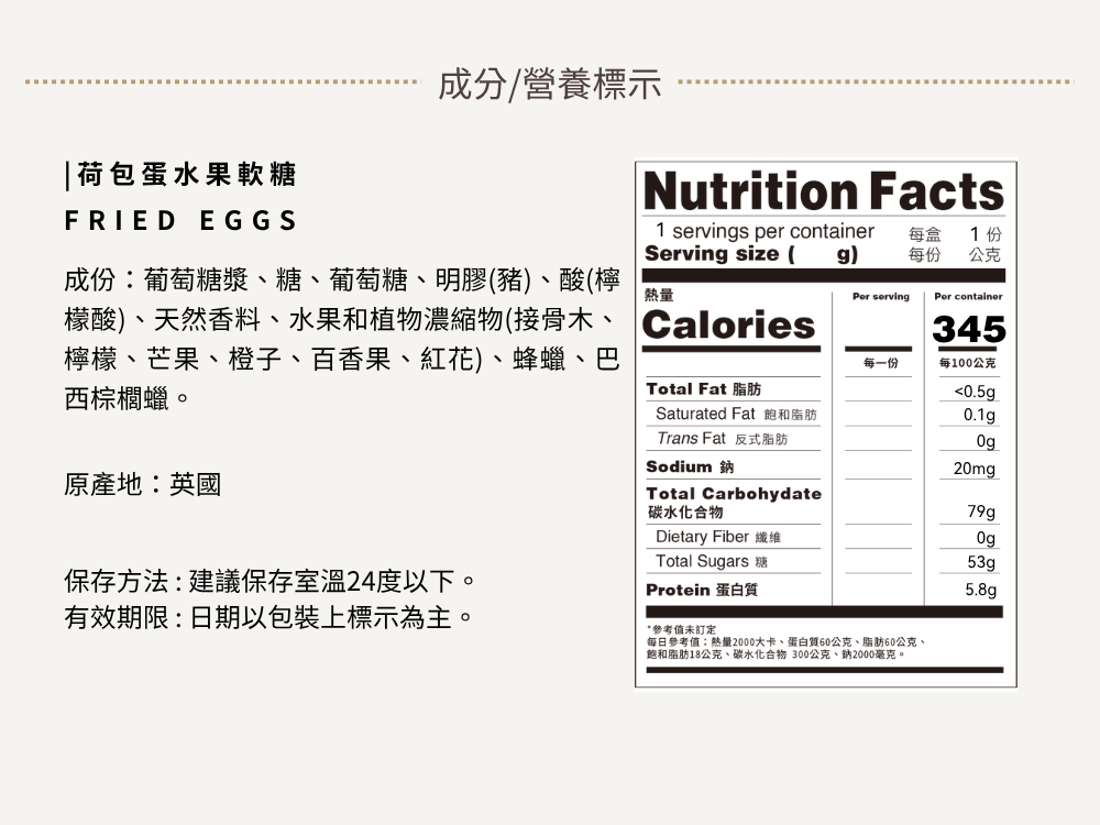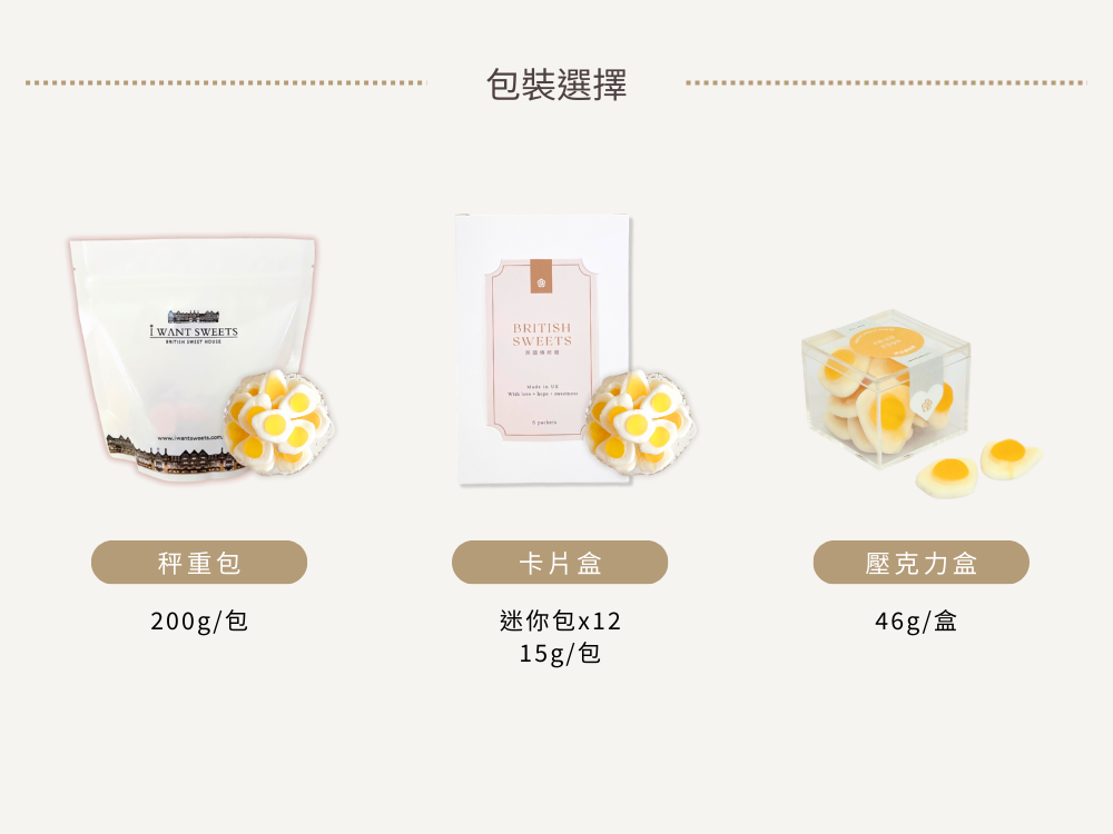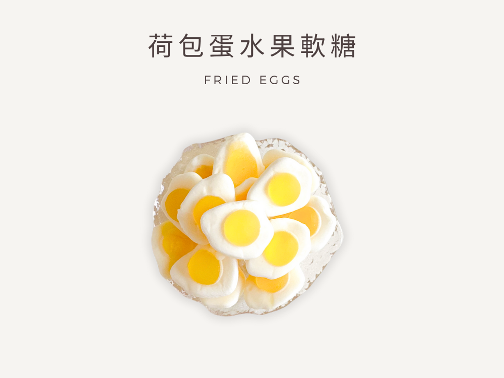 可愛又搞怪的Fried Eggs 荷包蛋水果軟糖,以「煎蛋」為造型靈感,將滑嫩的蛋白與飽滿蛋黃變身成酸甜可口的果味軟糖。白色泡棉糖模擬蛋白,柔軟輕盈,中心黃色果味糖則Q彈飽滿,完美還原視覺與口感的雙重驚喜!