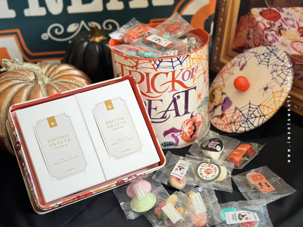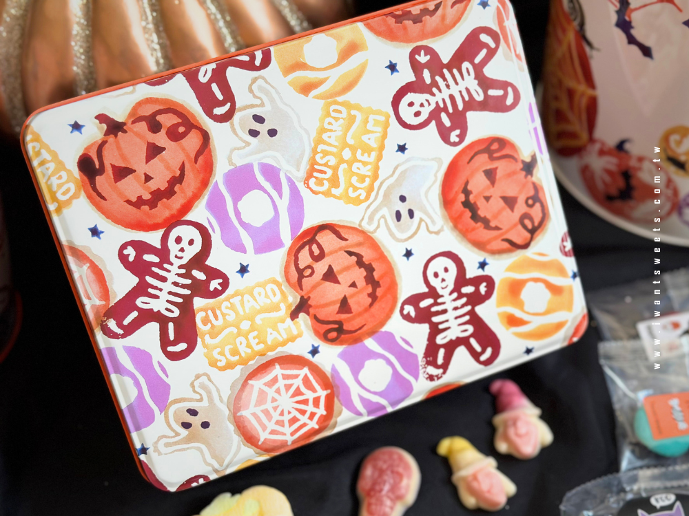 盒身繪有飛舞的幽靈、骷髏、南瓜頭和蜘蛛絲,彷彿將萬聖夜的奇幻場景凝縮其中。