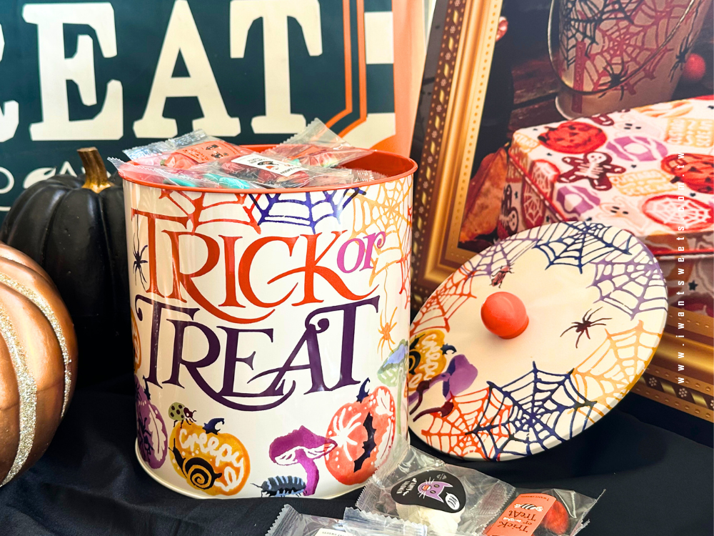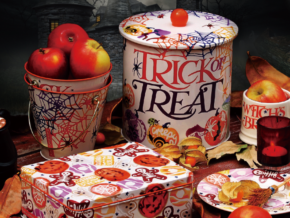 Emma Bridgewater 為萬聖節打造的限定糖果桶,外觀充滿童趣萬聖圖案:蝙蝠、南瓜燈、黑貓一應俱全,結合經典英式插畫風格與節慶歡樂氛圍。