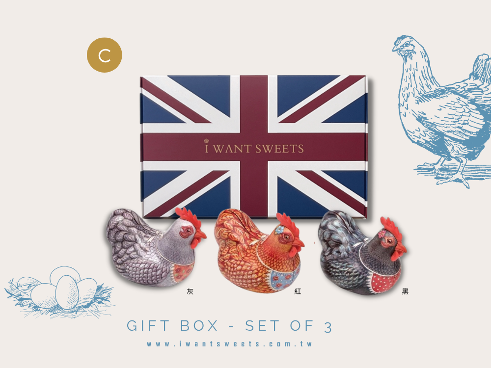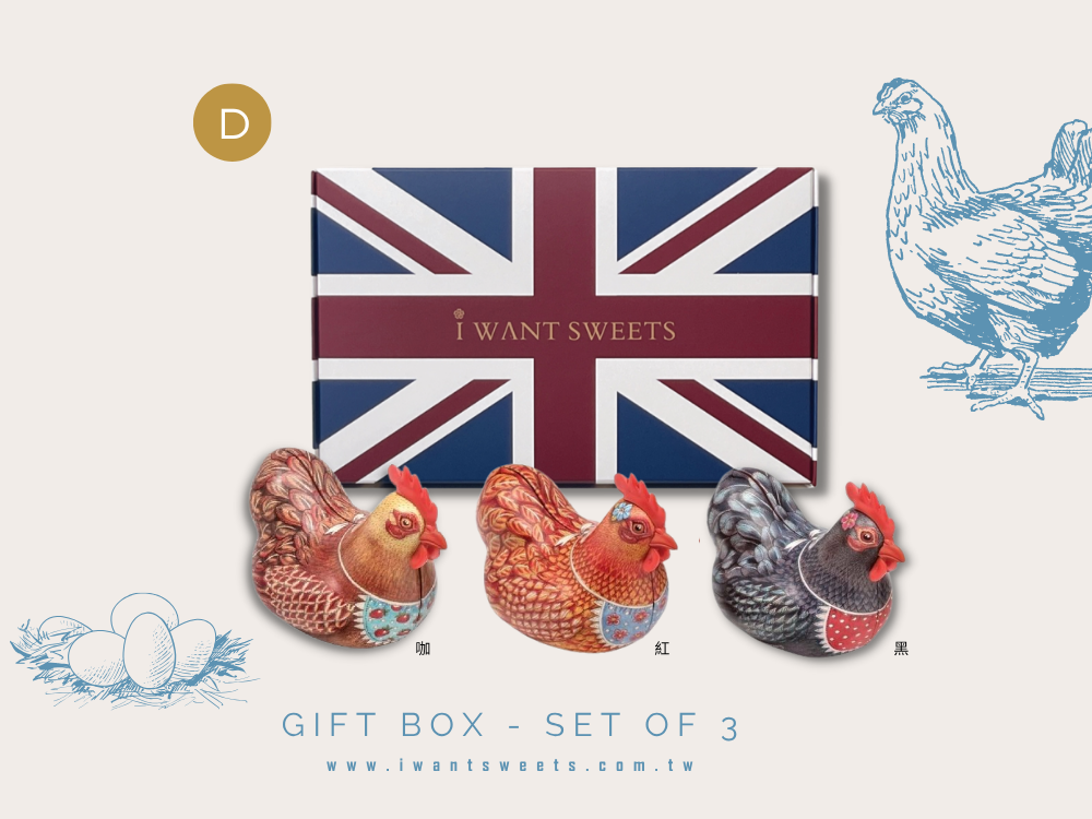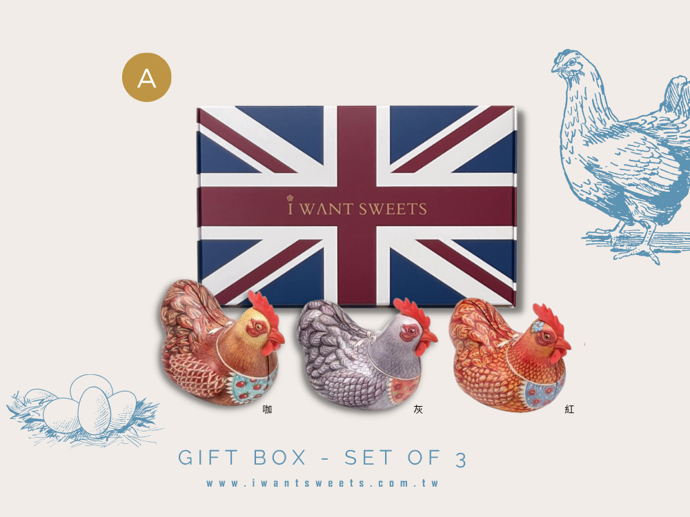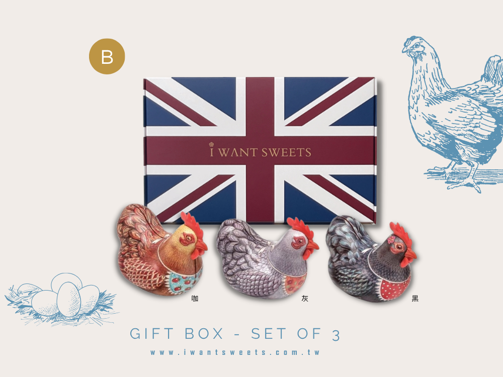 三隻快樂母雞,帶來滿滿的童趣與甜蜜!造型鐵盒以可愛母雞為主角,色彩繽紛、表情逗趣,宛如農場裡最有個性的明星主角。