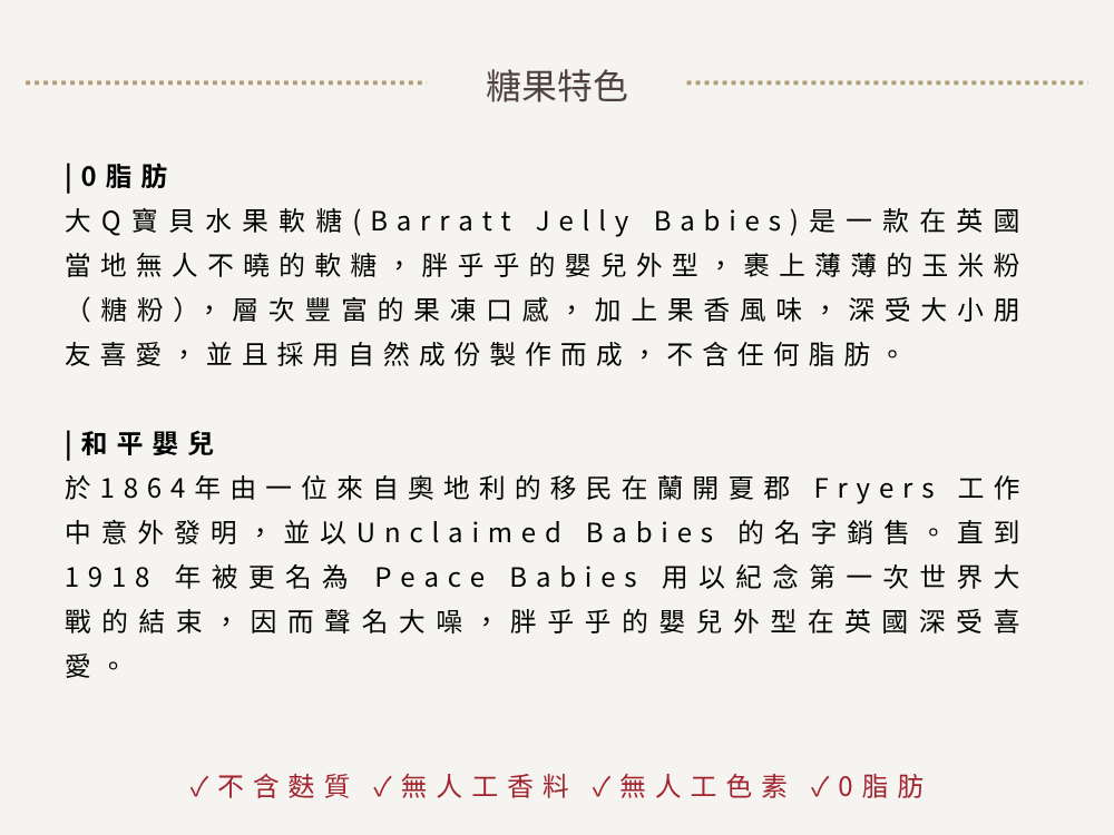 Jelly Babies 是英國家喻戶曉的懷舊軟糖代表,自1918年誕生以來就陪伴了無數人的童年記憶。