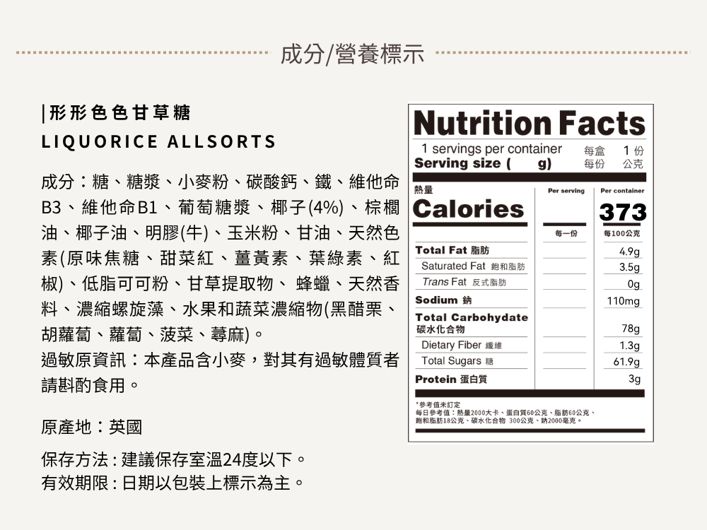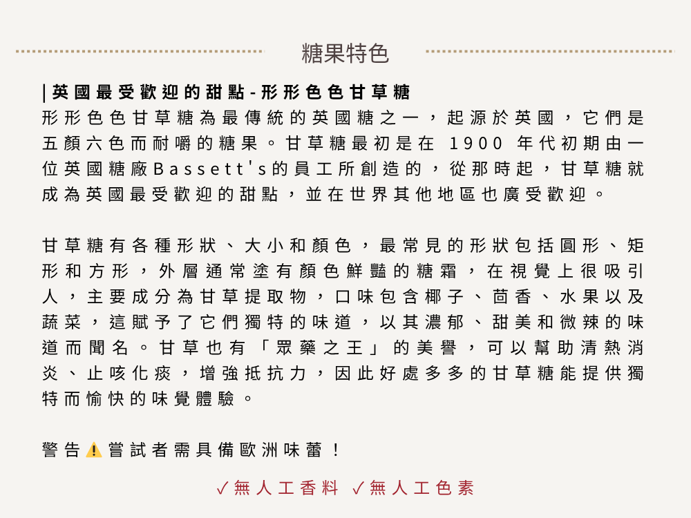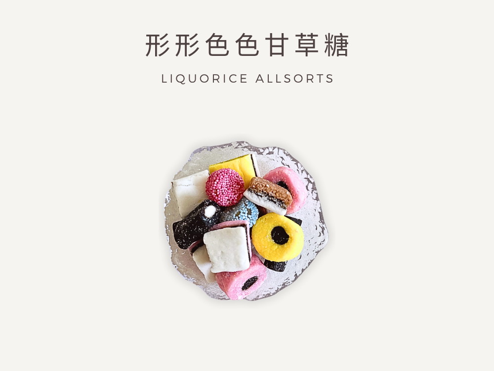 Liquorice Allsorts 是來自英國的傳統糖果系列,以其獨特的甘草風味與豐富造型組合聞名於世。從圓的、方的、條狀的,到層層堆疊的糖體結構,每一顆都像是迷你藝術品,色彩繽紛,趣味十足。甜中帶鹹、略帶植物系苦甘,是甘草控的夢幻逸品,也是懷舊英式糖果的代表之一。這款糖果系列將黑色甘草糖漿與各種糖衣、椰絲糖、果味糖層結合,形成口感豐富、層次感強的嚼感體驗。入口時先是外層甜味,隨之而來的是濃厚甘草香,尾韻獨特且回甘,令人印象深刻。
