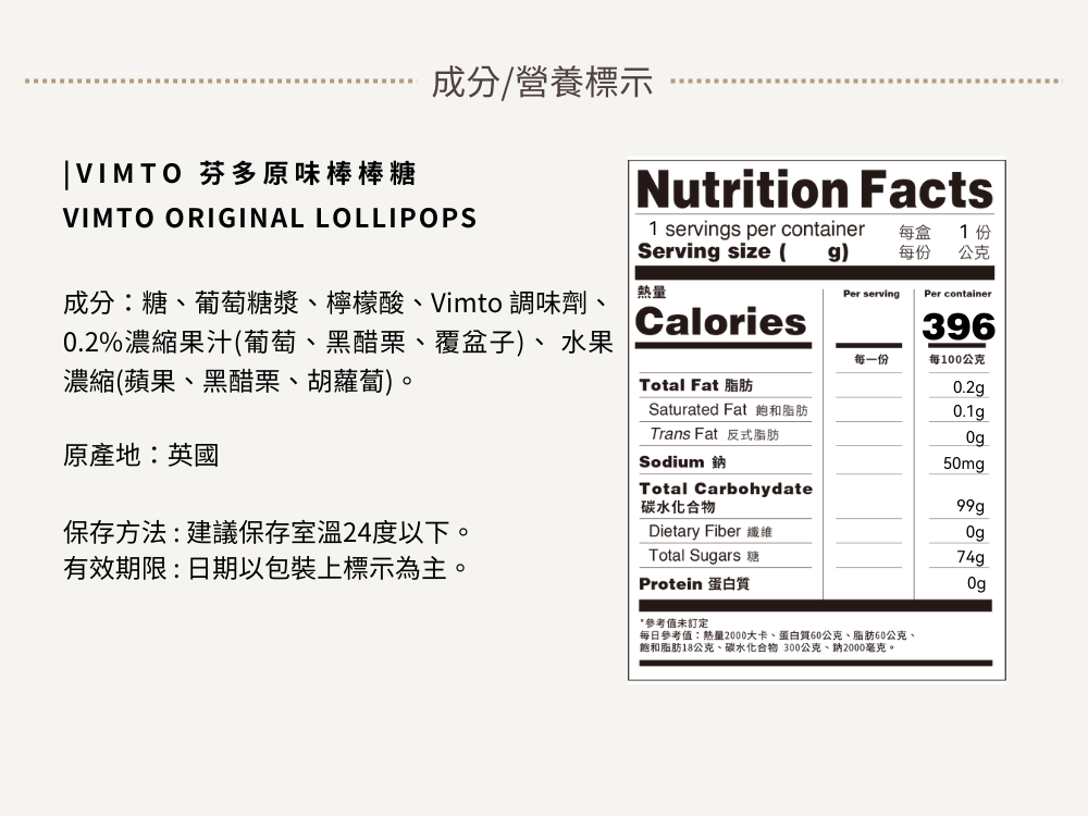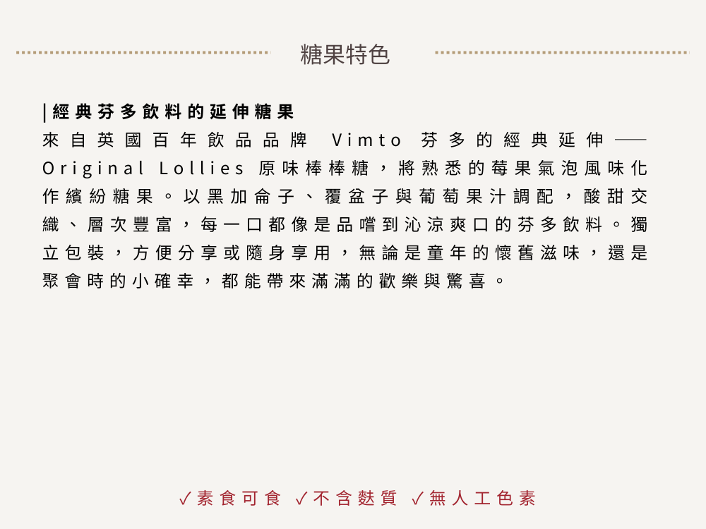 來自英國百年飲品品牌 Vimto 芬多的經典延伸——Original Lollies 原味棒棒糖,將熟悉的莓果氣泡風味化作繽紛糖果。以黑加侖子、覆盆子與葡萄果汁調配,酸甜交織、層次豐富,每一口都像是品嚐到沁涼爽口的芬多飲料。獨立包裝,方便分享或隨身享用,無論是童年的懷舊滋味,還是聚會時的小確幸,都能帶來滿滿的歡樂與驚喜。