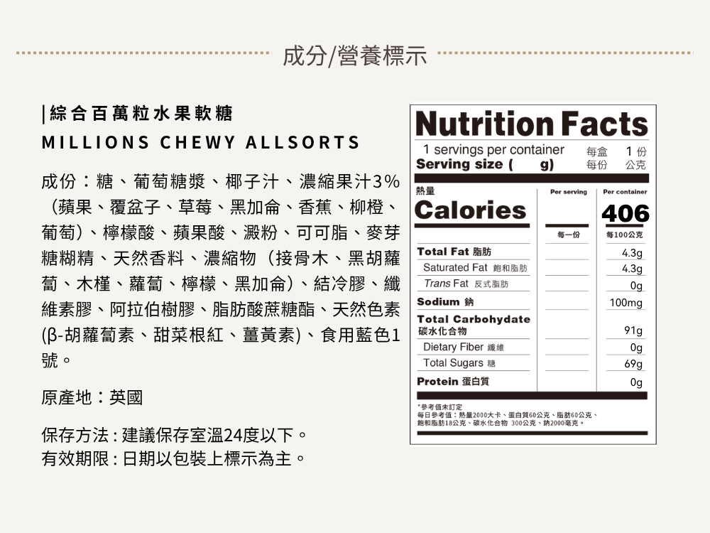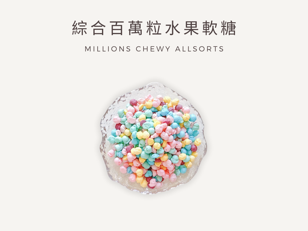 綜合百萬粒水果軟糖是為「選擇困難者」量身打造的夢幻版本!將多款人氣口味如草莓、蘋果、橘子、可樂、泡泡糖等集結一起,讓你一口咬下就能嚐到驚喜連連的百萬組合。
