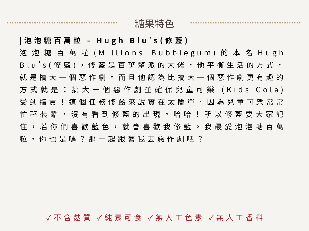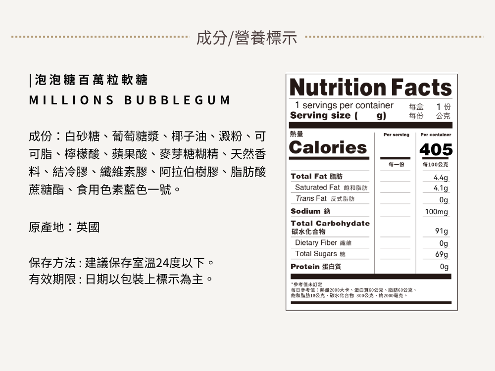 來自英國的國民級零食品牌 Millions,以一顆顆小到可愛的米粒狀軟糖風靡歐洲。這款「泡泡糖風味」版本更是經典代表,融合濃郁香甜的泡泡糖口味與獨特 Q 彈口感,酸酸甜甜、嚼感十足,讓人一口接一口停不下來!每一顆糖都像是微縮版的快樂炸彈,無論是撒在蛋糕上、加在冰淇淋裡,還是直接倒進嘴裡狂嗑,都超級療癒!不含明膠,適合素食者,大小朋友都能安心享用。