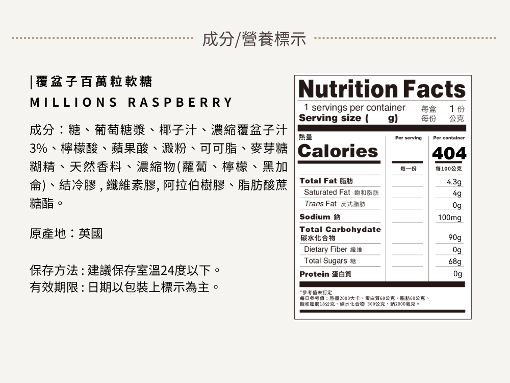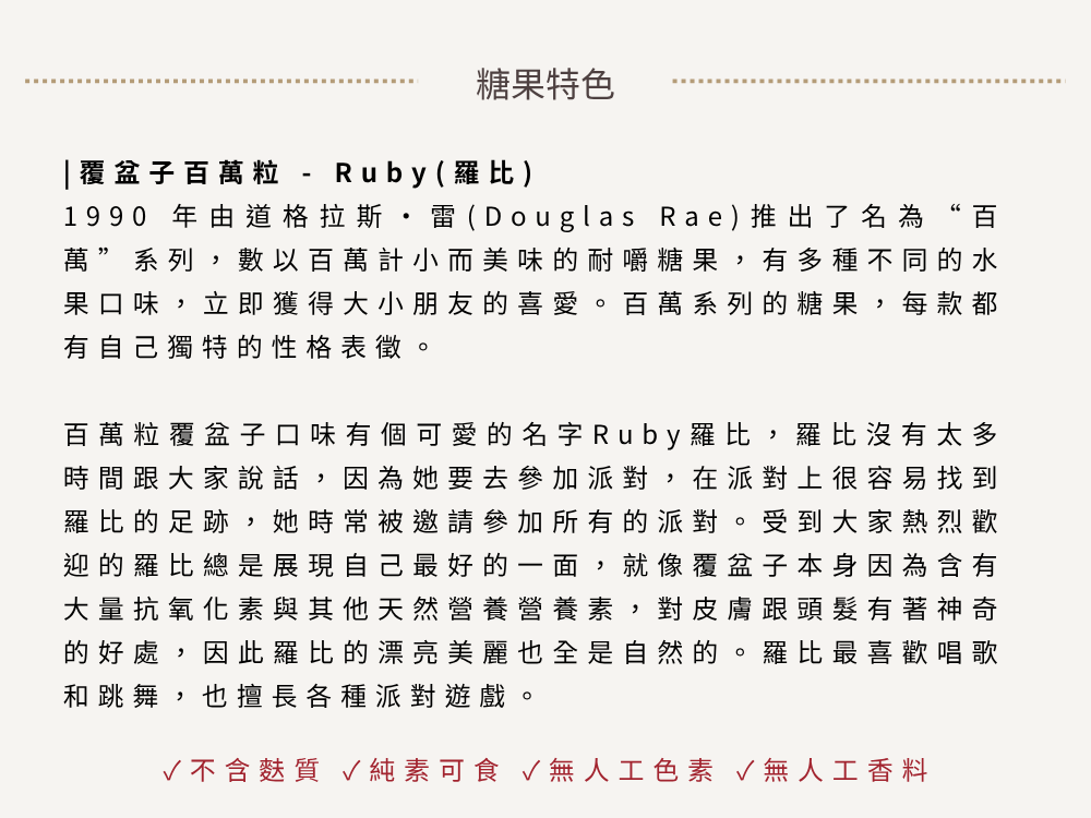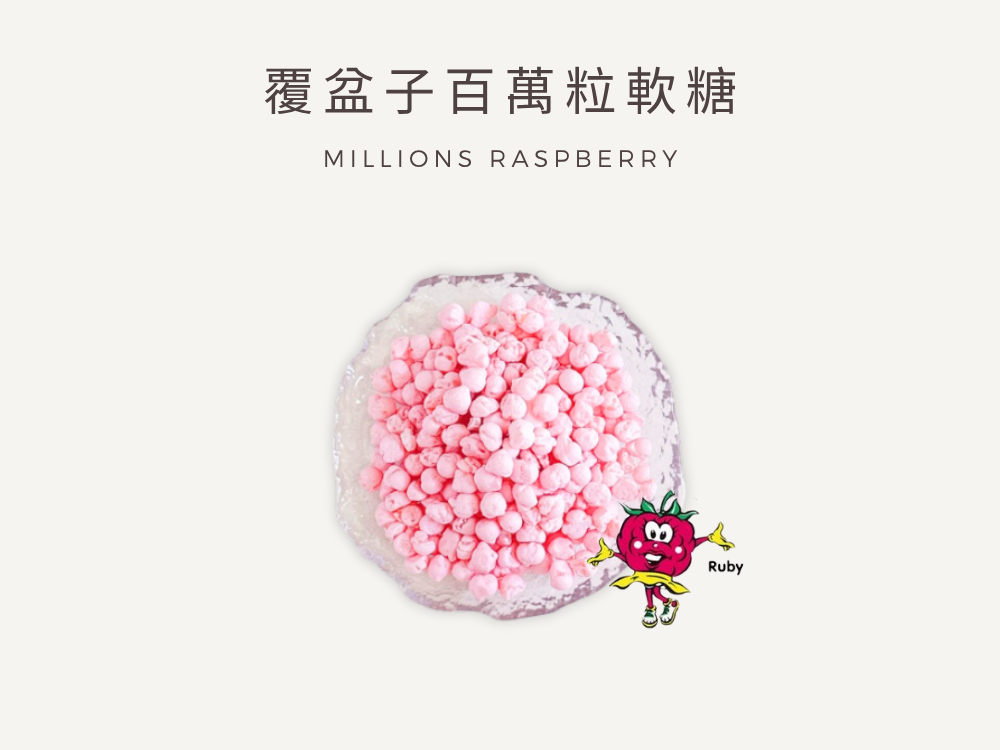 覆盆子口味的百萬粒軟糖,以鮮明莓果風味與標誌性 Q 彈口感深受喜愛。每一顆如米粒大小的小糖果,外型迷你可愛,酸酸甜甜的覆盆子香氣在嘴裡緩緩綻放,咀嚼之間充滿層次感,是大人小孩都會愛上的療癒小零嘴。粉嫩的莓果色系、香氣濃郁卻不膩口,不管是午後補糖、旅途中隨手一把,還是搭配冰淇淋、蛋糕點綴,都超級加分。不含明膠,純素可食,用最安心的配方守住你的甜甜心情。