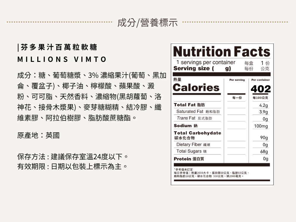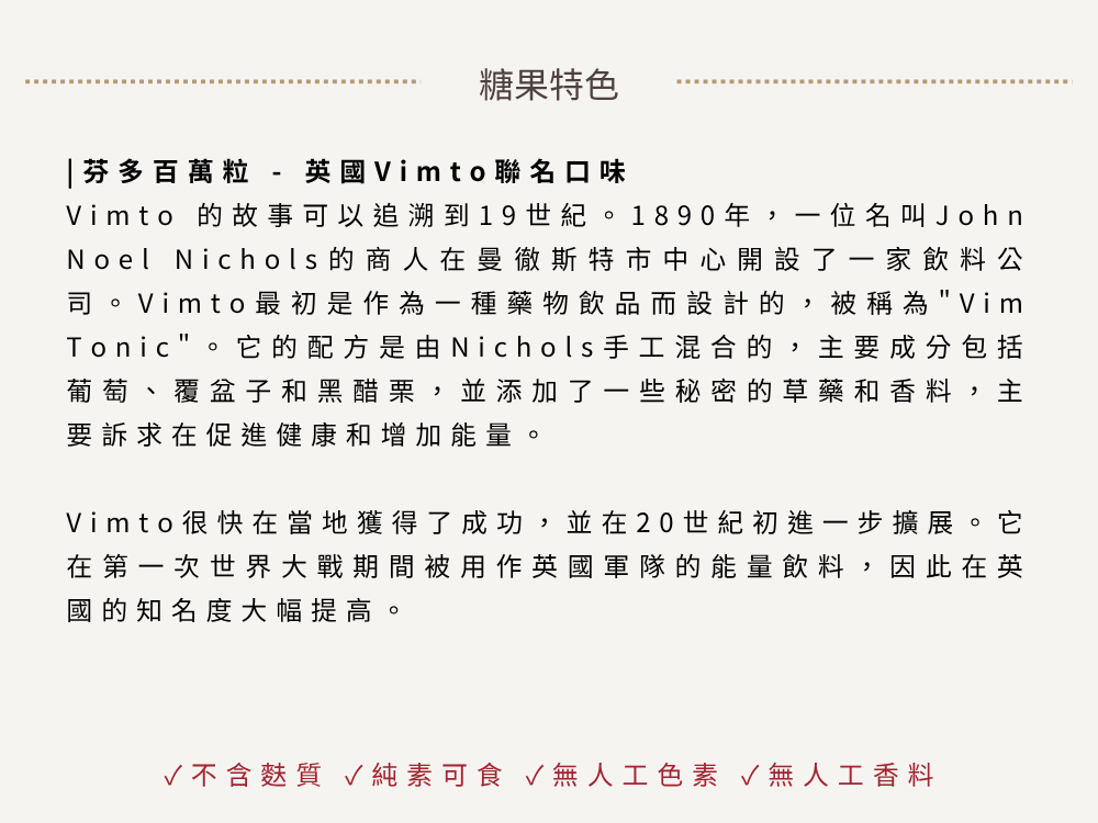 Vimto 為英國國民級果汁品牌,擁有超過百年歷史,而這款聯名糖果不只重現原汁原味,更為 Millions 系列增添一抹經典韻味。