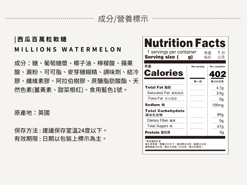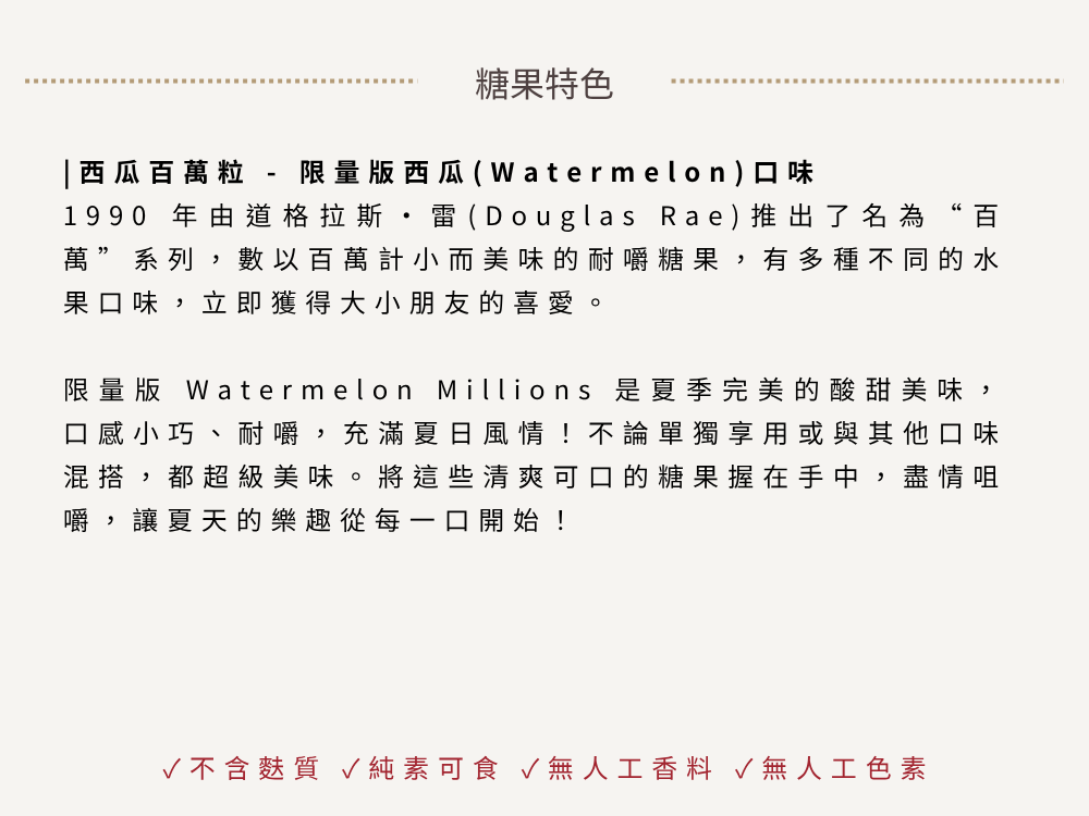 限量版 Watermelon Millions 是夏季完美的酸甜美味,口感小巧、耐嚼,充滿夏日風情!不論單獨享用或與其他口味混搭,都超級美味。將這些清爽可口的糖果握在手中,盡情咀嚼,讓夏天的樂趣從每一口開始!