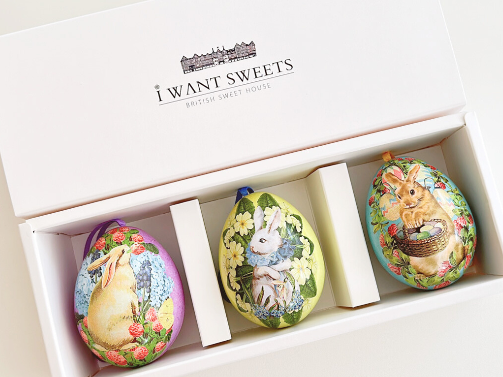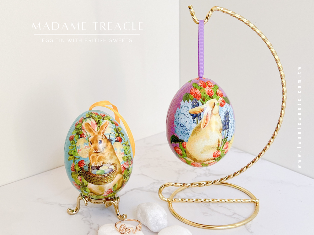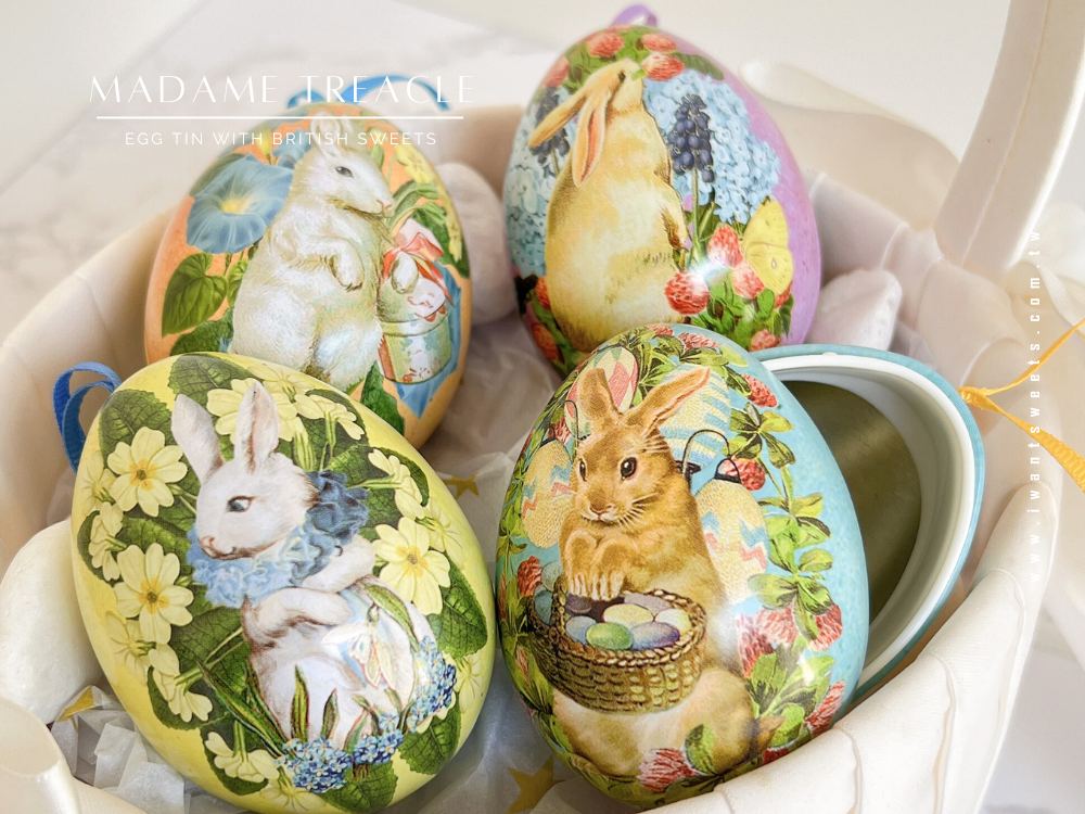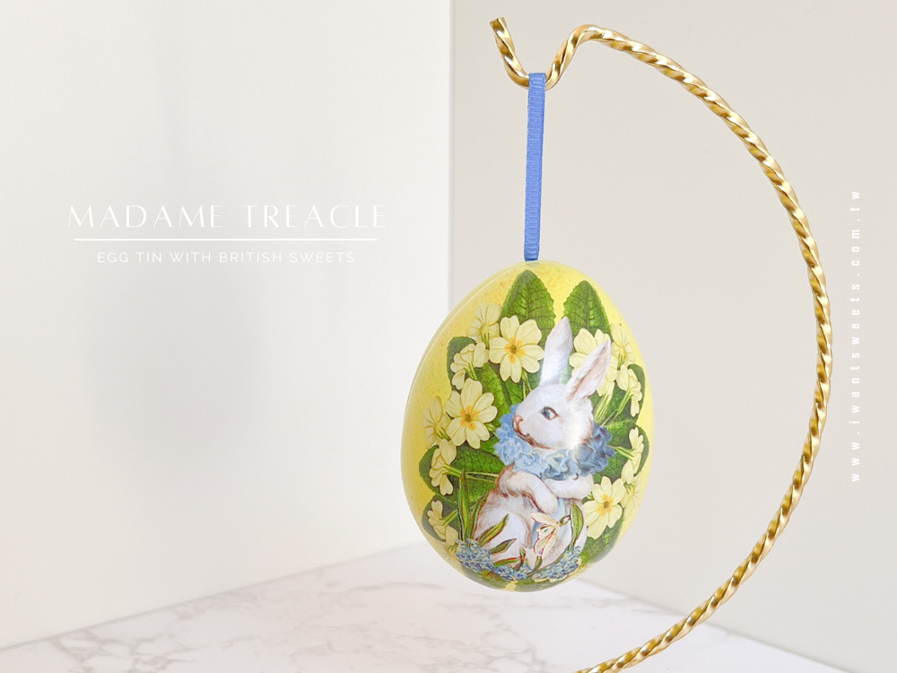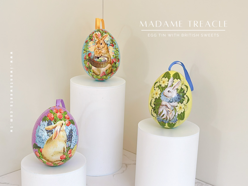 Madame Treacle 的復古繪圖系列,以華麗印刷與懷舊童話感聞名。這款小巧糖果鐵盒以復古兔子與花卉彩蛋為主題,宛如春日童話般精緻可愛。