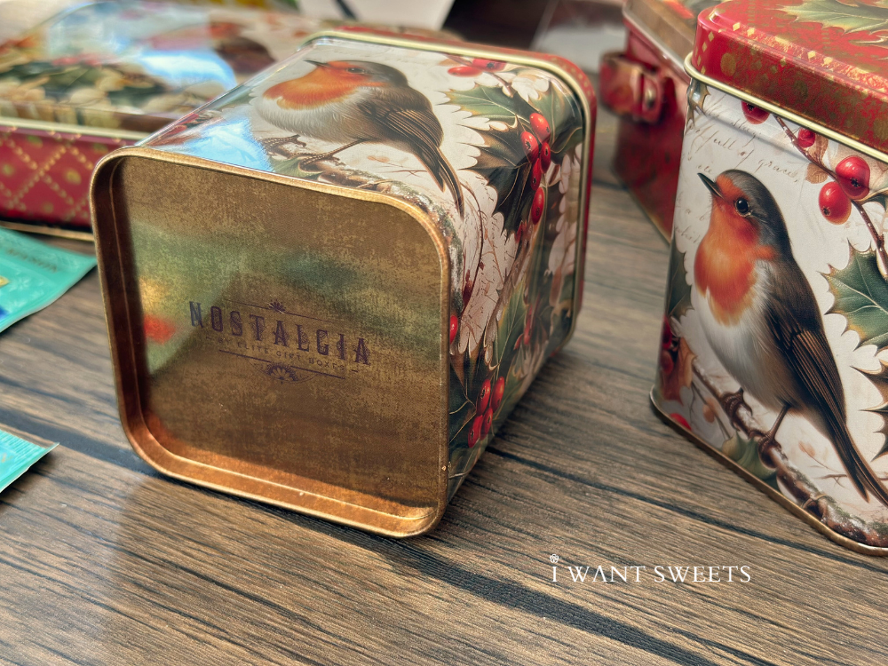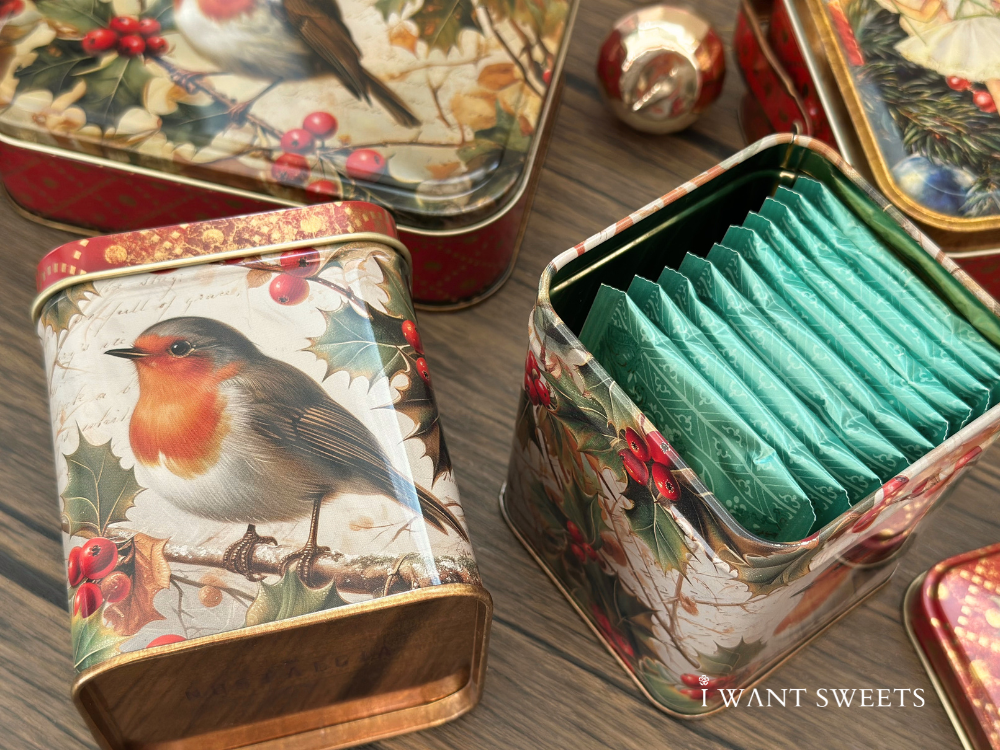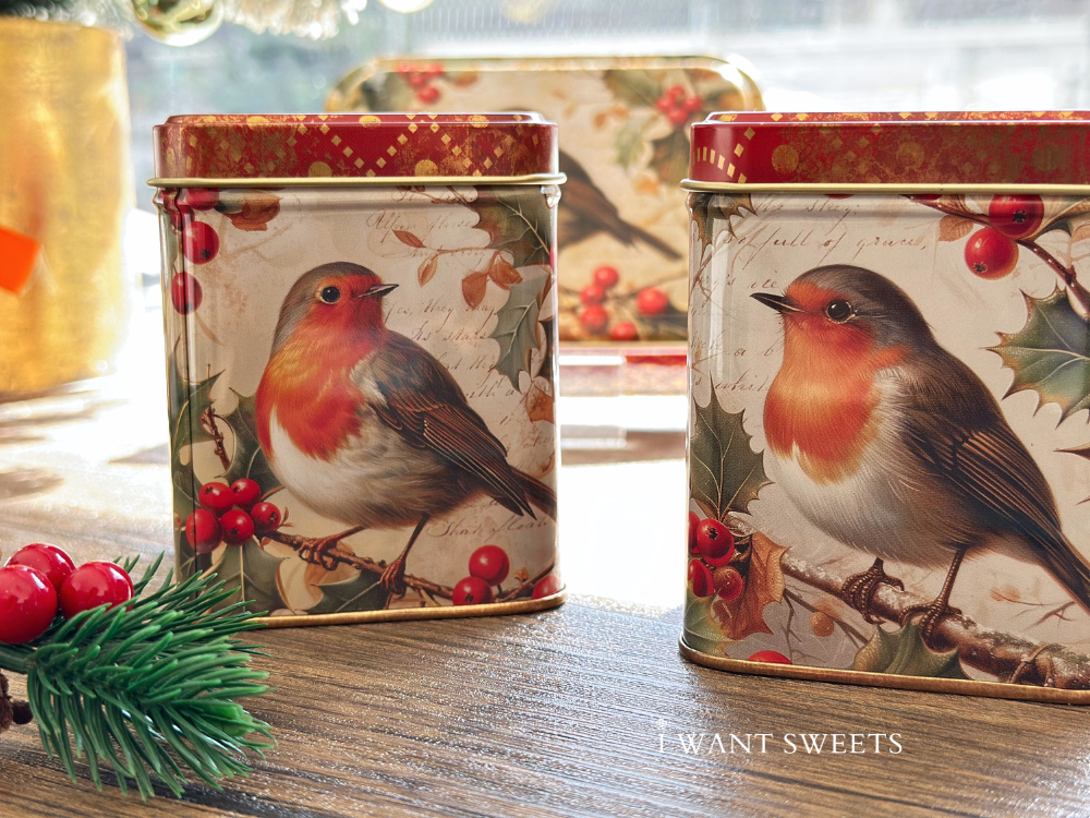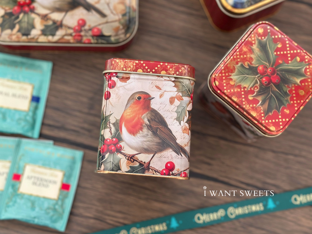 經典英倫復古風為設計核心。盒身繪有一隻嬉戲的紅胸知更鳥,金色邊框添上一抹華麗質感,與細膩的冬季枝葉圖案交融,營造出如同舊時賀卡般的節慶氛圍。純淨的背景色調使主題鳥兒更為鮮明,整體塑造出一款兼具童趣與典雅的收藏佳品。