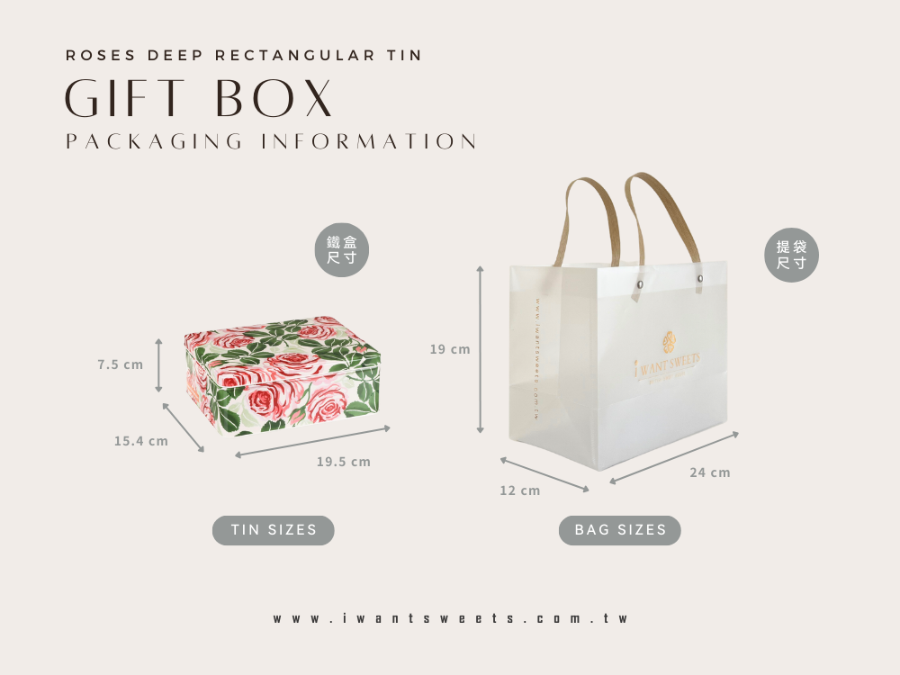 盒身以柔和的奶油白為底色,鋪滿層層疊疊的紅玫瑰與粉玫瑰花朵,搭配嫩綠葉片交錯,彷彿將整片花園濃縮進方正的鐵盒中。花瓣的筆觸細膩而自然,色彩層次豐富,營造出浪漫而溫柔的氛圍。