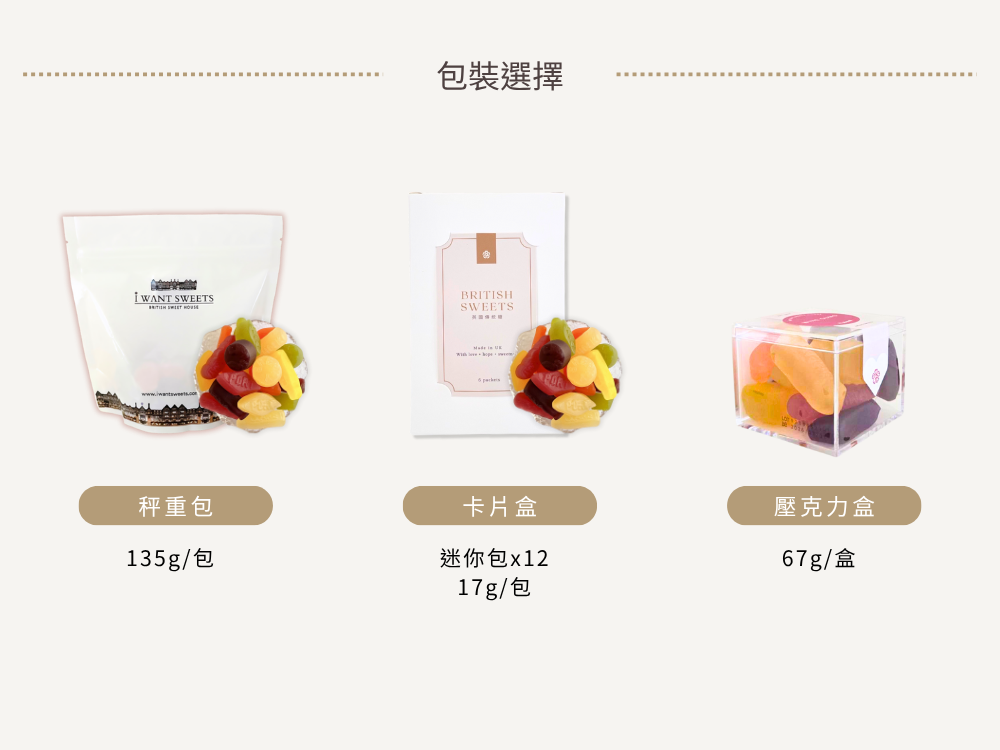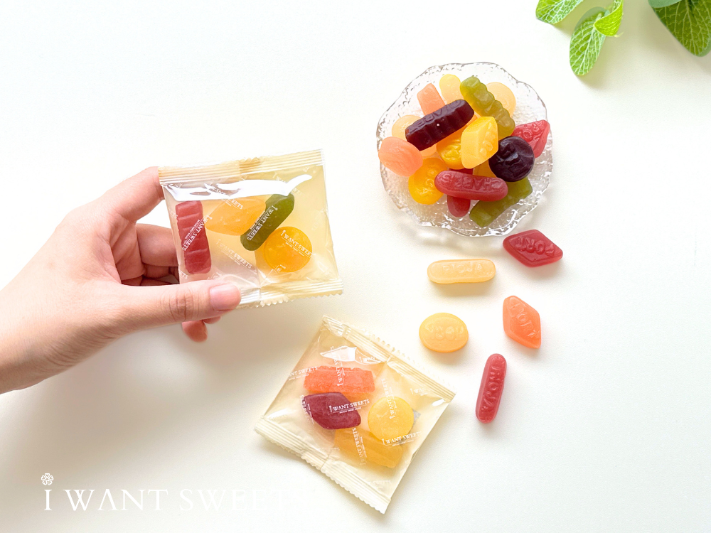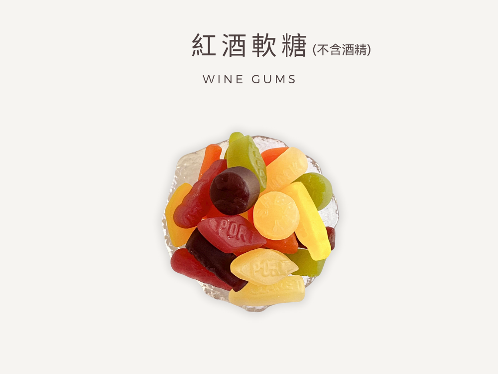 每顆軟糖擁有不同果味,如黑加侖、覆盆子、柳橙、檸檬與青蘋果等,香氣自然、甜度適中,口感介於硬糖與果凍之間,特別適合喜歡咀嚼感與不嗜甜者。搭配獨特的「酒標字樣」壓紋設計,別具英倫復古風情。