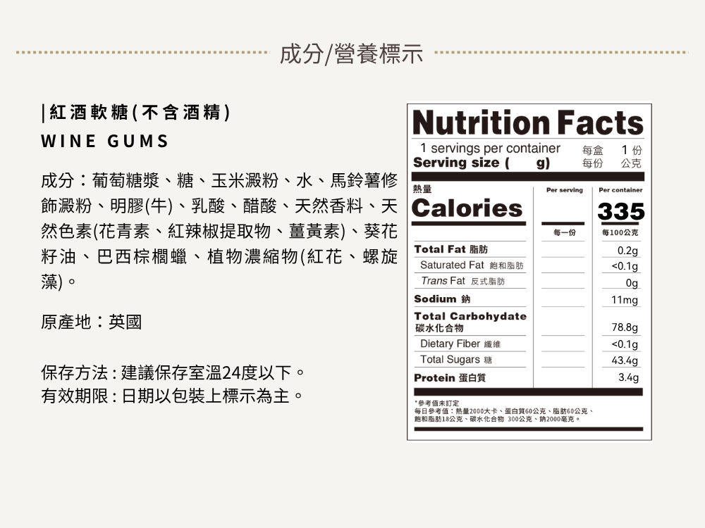 來自英國百年傳統的經典軟糖——Wine Gums,名字雖有「紅酒」,實際上卻完全不含酒精,而是以紅酒文化為靈感,打造出多層次果香與彈韌口感的迷人糖果。色澤飽滿、造型復古,入口Q彈不黏牙,愈嚼愈香,是英國人從小吃到大的國民級零嘴。