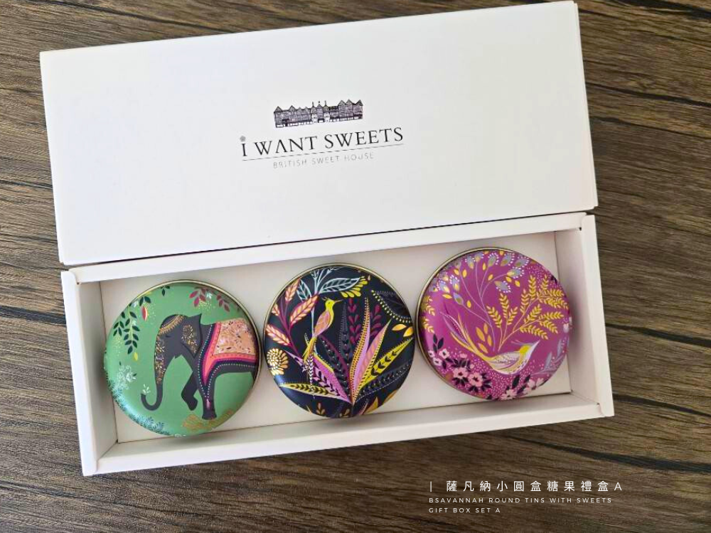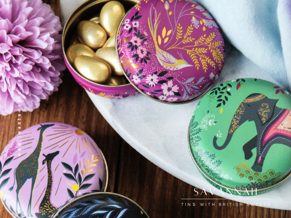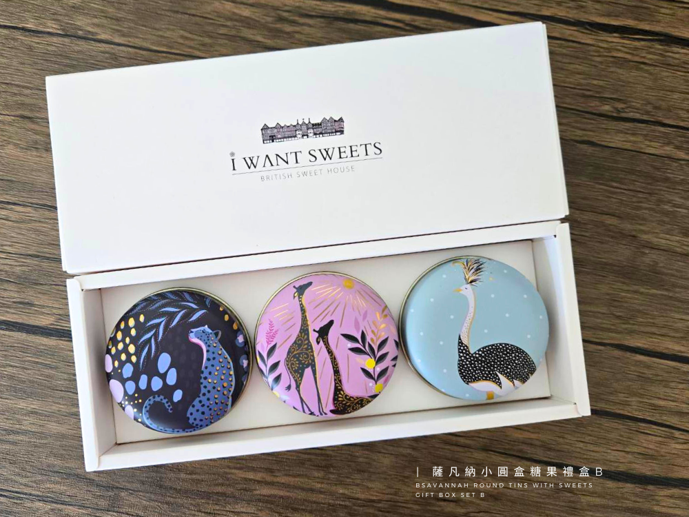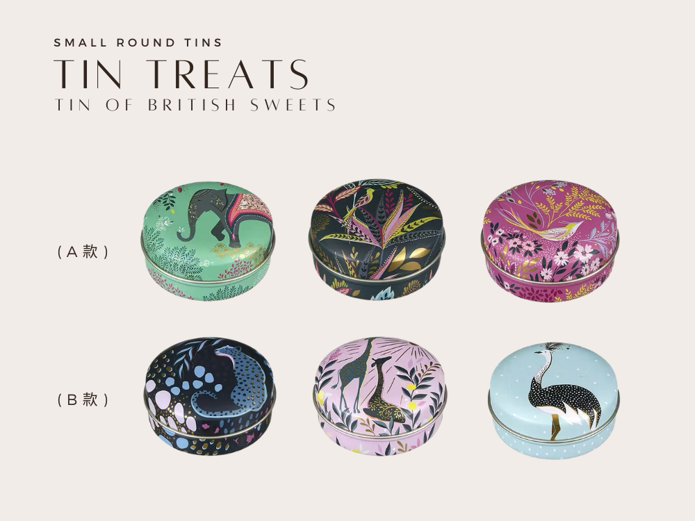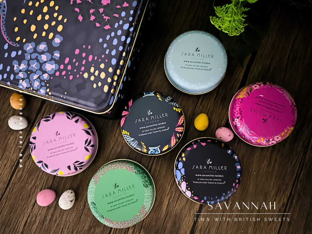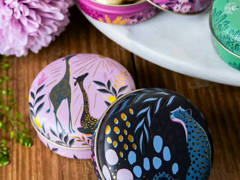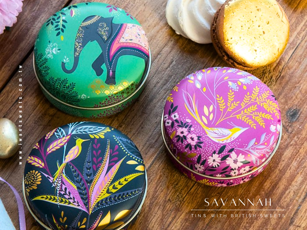 精緻小圓形鐵盒,結合英國 Sara Miller 的拿手圖騰設計,以「薩凡納草原」為靈感,描繪絢爛夕陽下悠然漫步的長頸鹿、斑馬與熱帶花卉,每一處細節都以金箔點綴,散發低調奢華的異國魅力。