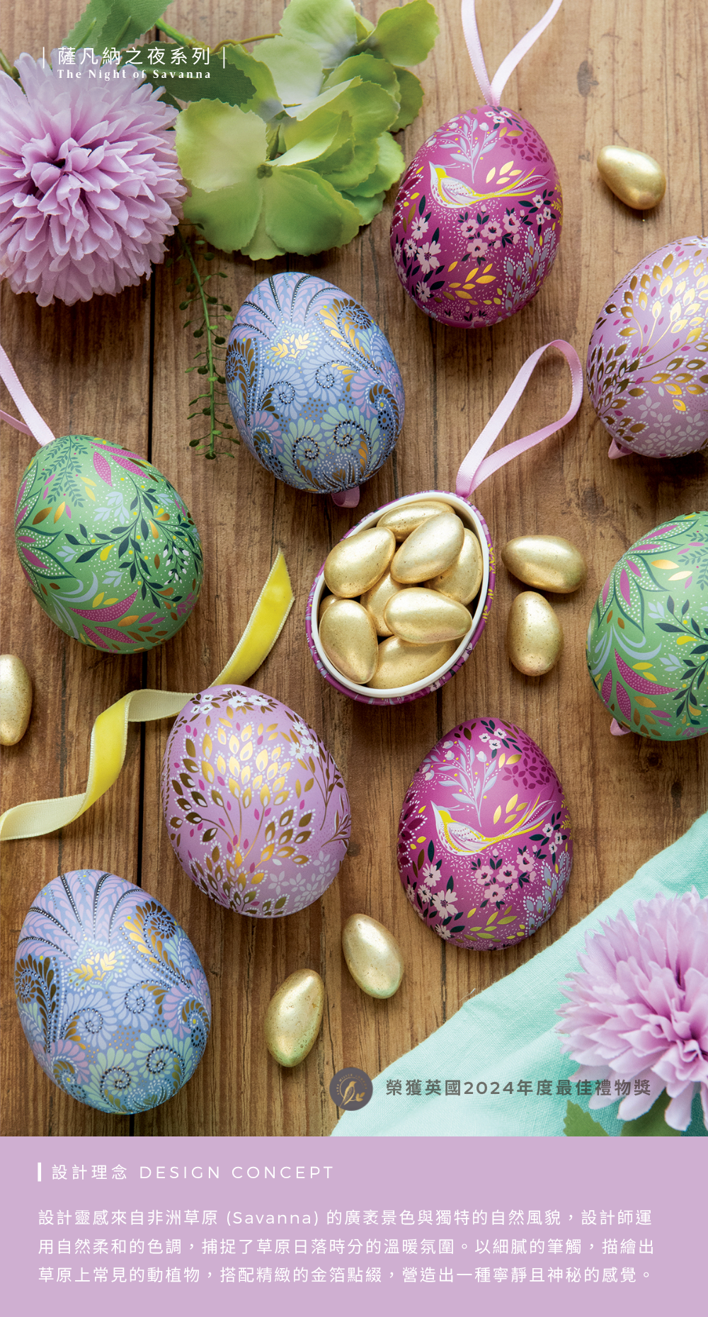 設計靈感來自非洲草原 (Savanna) 的廣袤景色與獨特的自然風貌,設計師運用自然柔和的色調,捕捉了草原日落時分的溫暖氛圍。以細膩的筆觸,描繪出草原上常見的動植物,搭配精緻的金箔點綴,營造出一種寧靜且神秘的感覺。