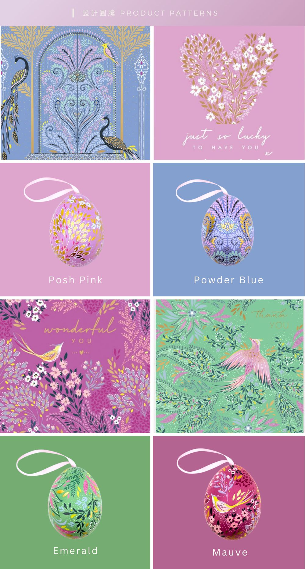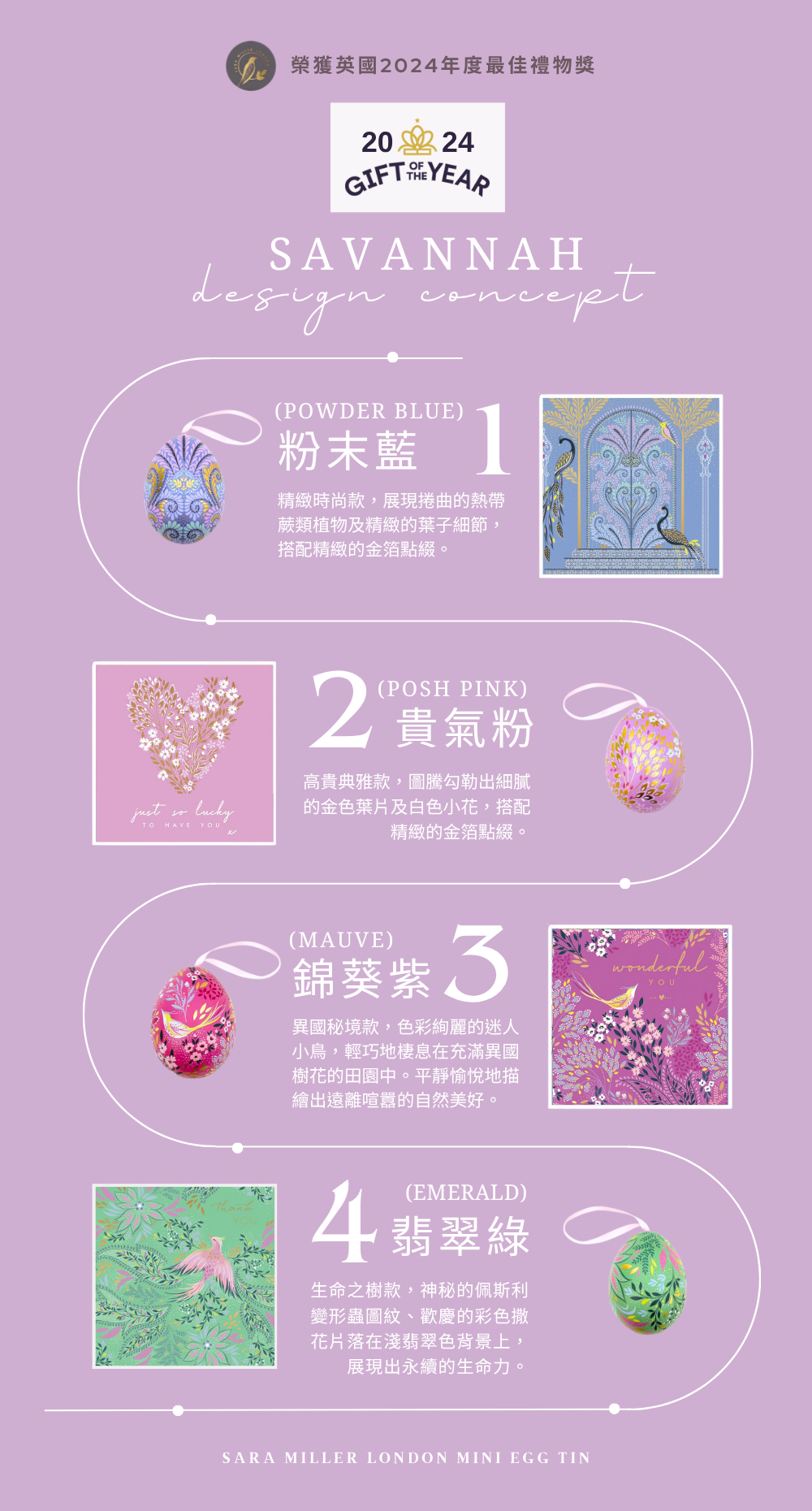設計靈感來自非洲草原 (Savanna) 的廣袤景色與獨特的自然風貌,設計師運用自然柔和的色調,捕捉了草原日落時分的溫暖氛圍。以細膩的筆觸,描繪出草原上常見的動植物,搭配精緻的金箔點綴,營造出一種寧靜且神秘的感覺。
