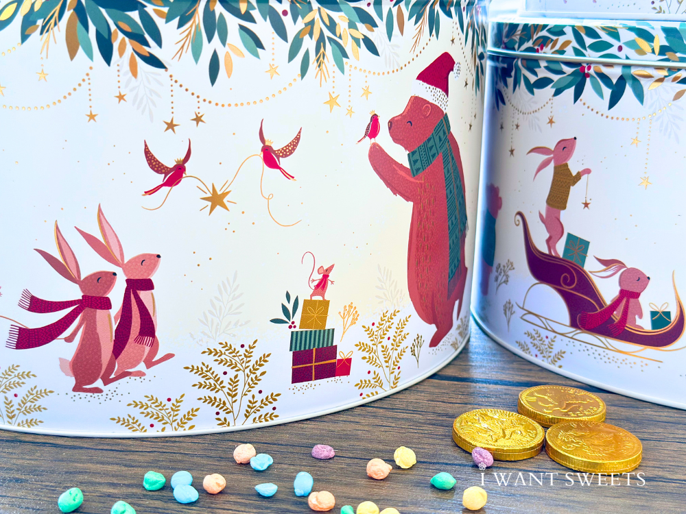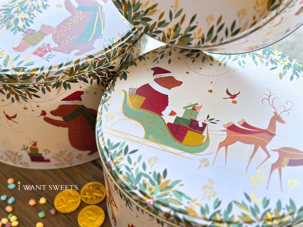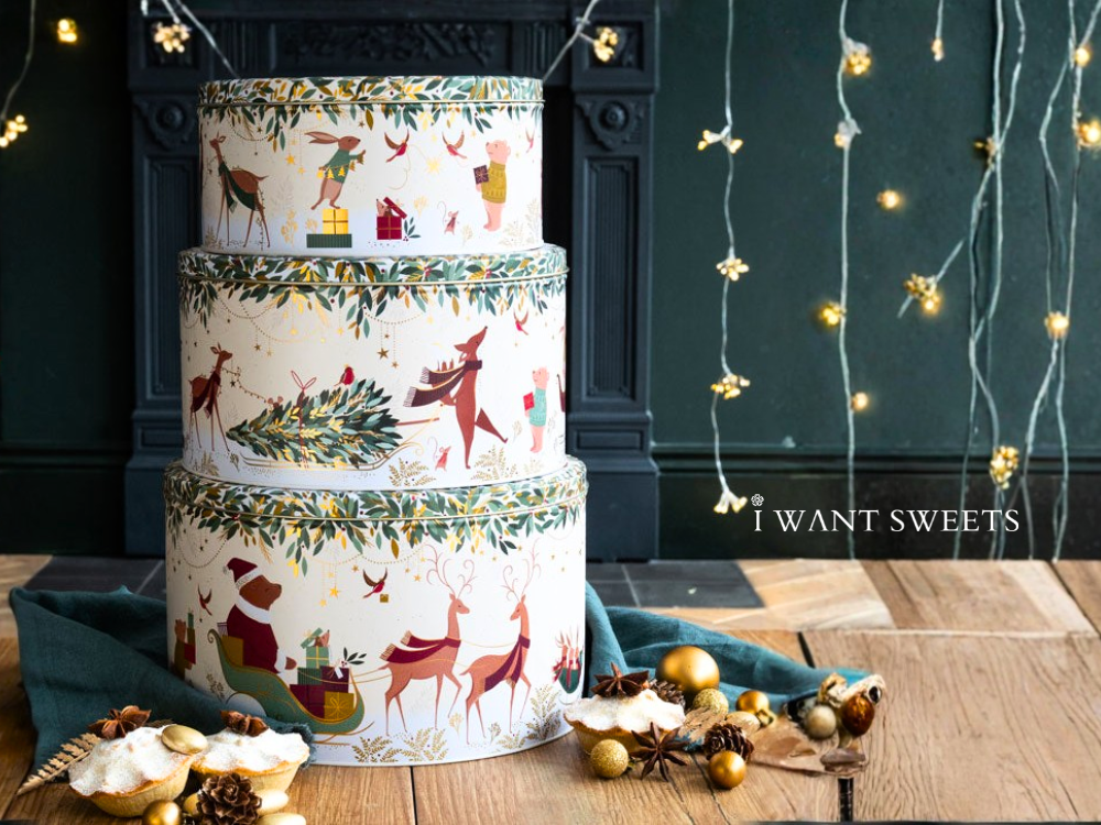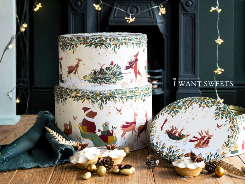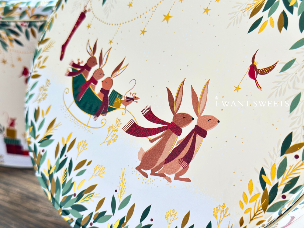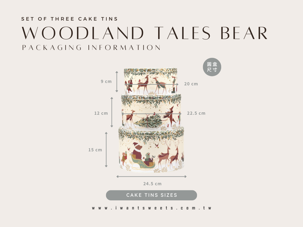 這款 Sara Miller Woodland Tales Set of 3 Round Cake Tins 以奶油白底為畫布,飾以金箔閃映的森林動物:小熊、森林鹿、松鼠們圍繞著飄雪的林間聖誕樹、披著圍巾的兔子們等,畫面細膩而富童趣。三款尺寸圓盒堆疊起來彷彿一座夢幻森林塔,金色線條環繞其中,讓整體設計既典雅又活潑,為冬日時光增添一抹英倫節慶的奇幻氛圍。