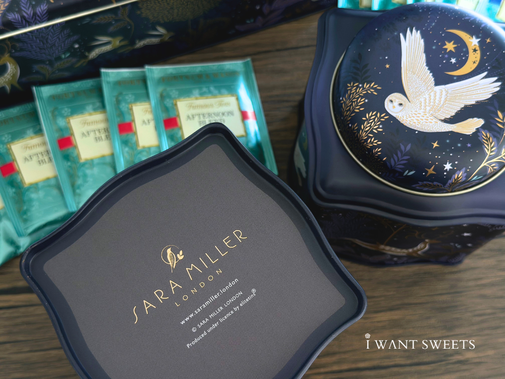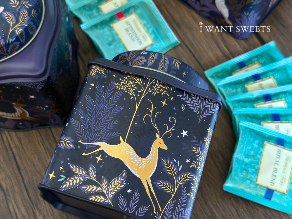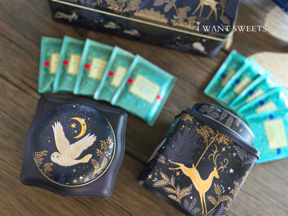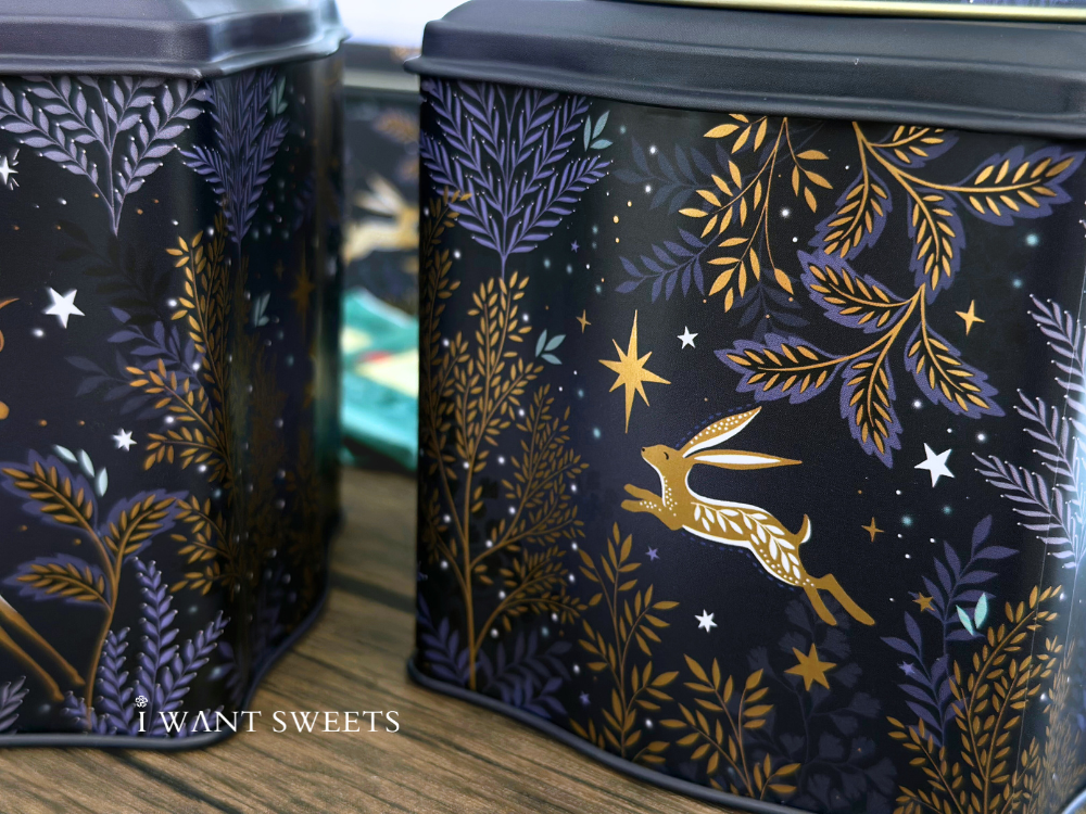 在雪夜靜謐的森林裡,貓頭鷹展翅、麋鹿悠步、兔子跳躍,這款圓頂鐵罐以月光下的自然景致為畫布,搭配精緻金線勾勒,優雅展現節慶的奇幻氛圍。空靈白底襯托深藍夜幕,柔和中透出奢華格調。