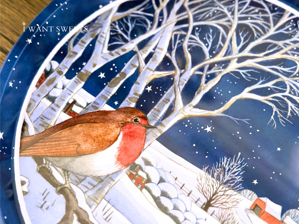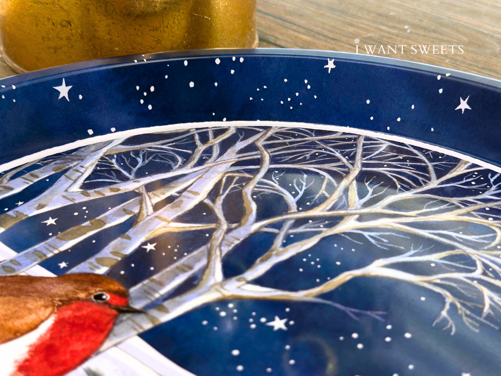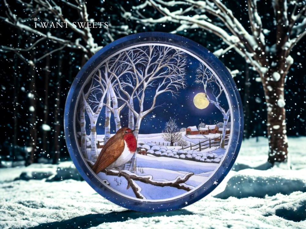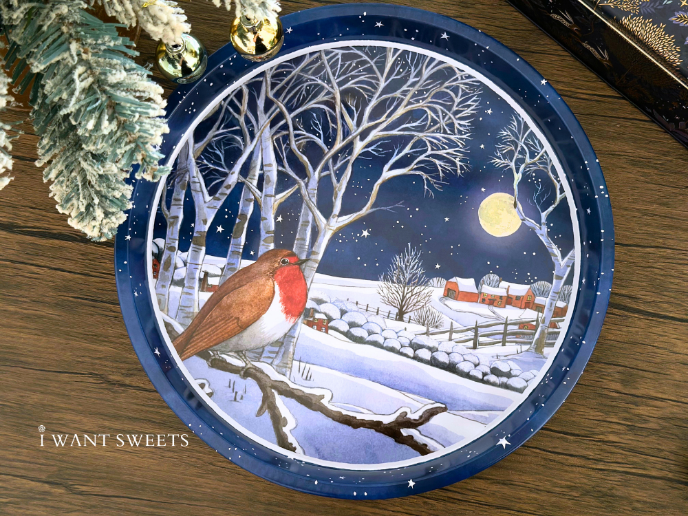 極致冬夜氛圍在這款鐵盤中躍然呈現:夜空深藍如絲,雪地銀白細緻綴滿畫面,一隻胸前鮮紅的知更鳥靜立枝頭。柔和筆觸與復古英倫配色交錯,勾勒出寧靜且富詩意的節慶場景,為空間增添一抹夢幻冬日美。