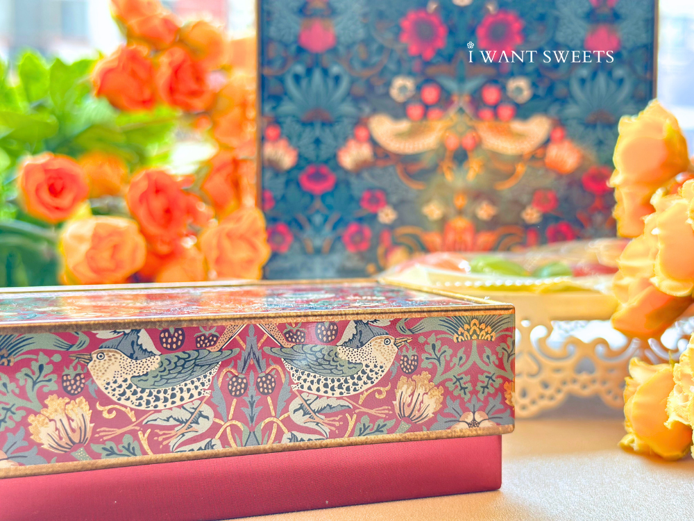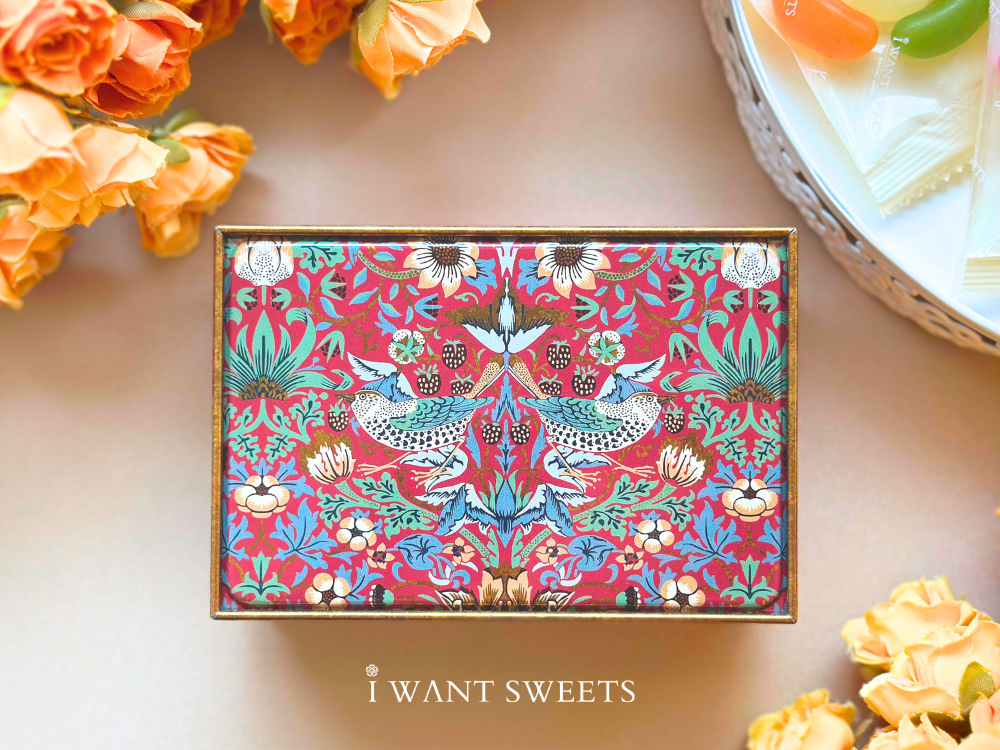 • William Morris  紅莓珍藏方形小珠寶糖果盒 - 紅 | William Morris Red Strawberry Thief Small Rectangular Tin with British Sweets