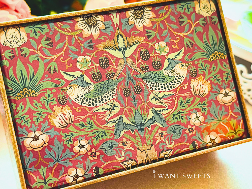靈感源自 William Morris 經典《Strawberry Thief》圖騰,紅莓與小鳥交織出細膩優雅的藝術氛圍。