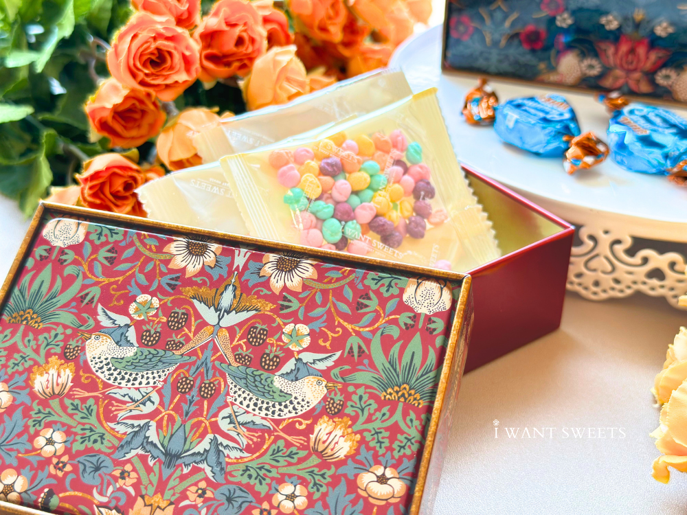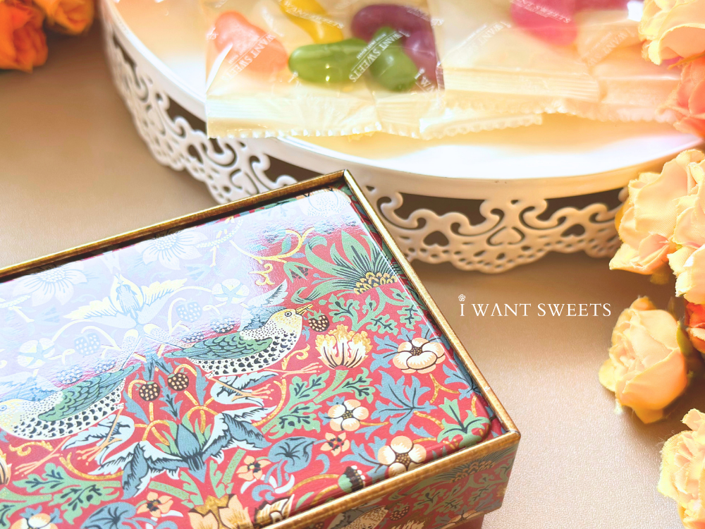 方形小珠寶鐵盒設計精巧,內含英國糖果,甜蜜與美感兼具。食用後可作收納使用,收藏戒指或小物皆宜,為日常增添一抹復古浪漫。