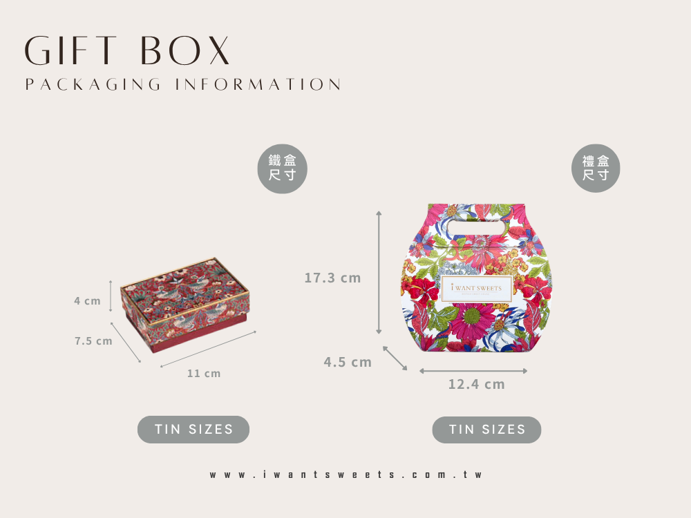 • 單款鐵盒尺寸:11 公分(最長) x 7.5公分(最寬)  x 4公分(最高) (個)