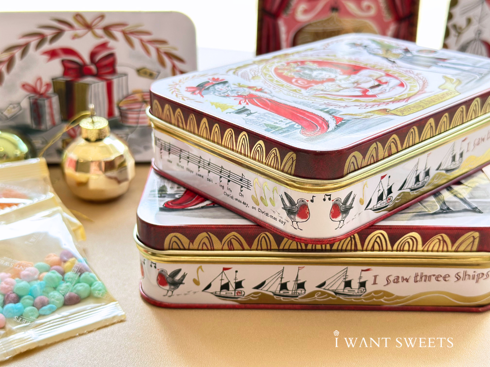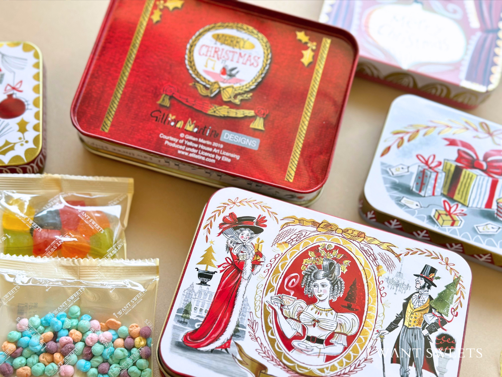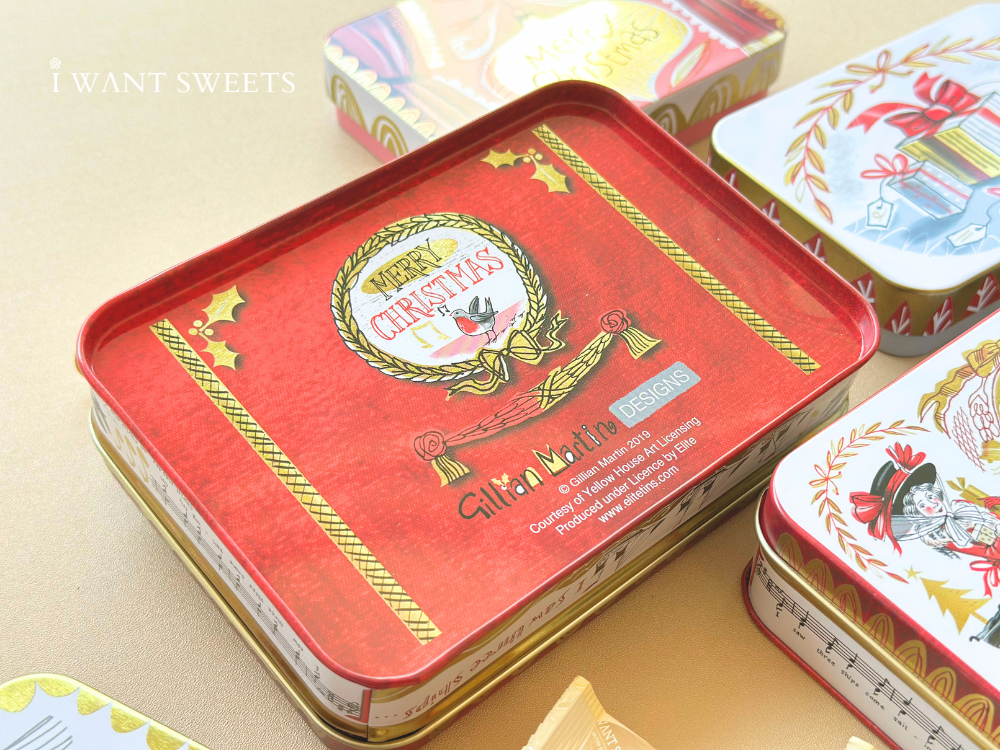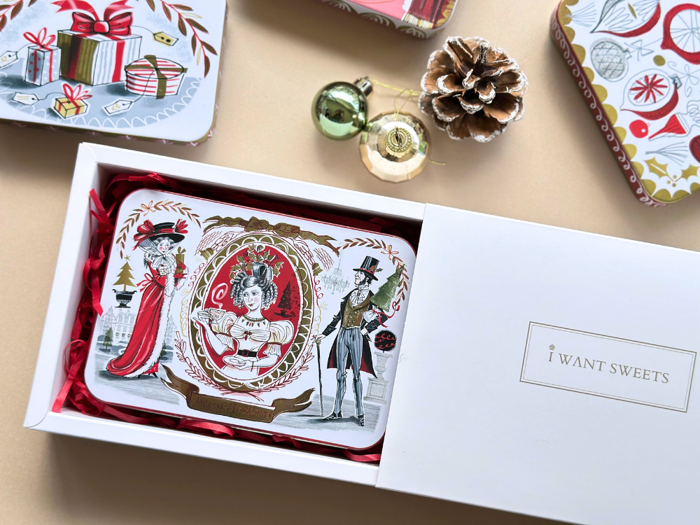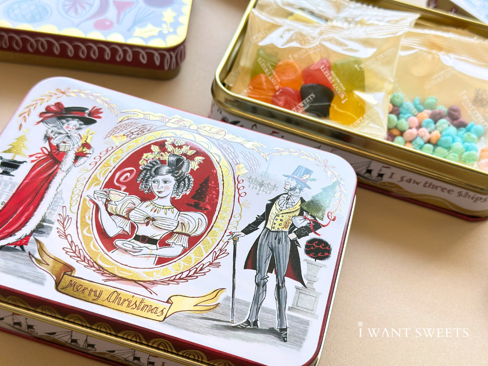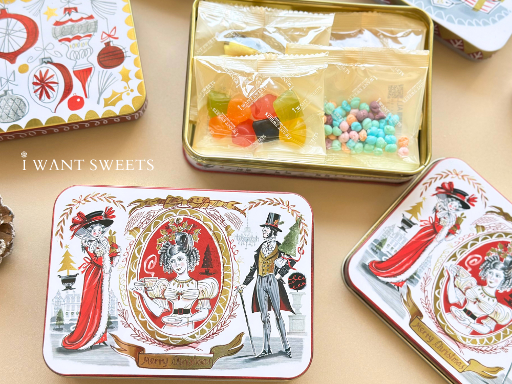 以華麗的維多利亞風格彩繪,經典紅金配色描繪身披猩紅色大衣的淑女與頭戴禮帽的紳士。圖案細膩重現英倫聖誕的隆重與歡慶,鐵盒小巧精緻,極具收藏價值與藝術美感,是不可多得的節日珍藏。
