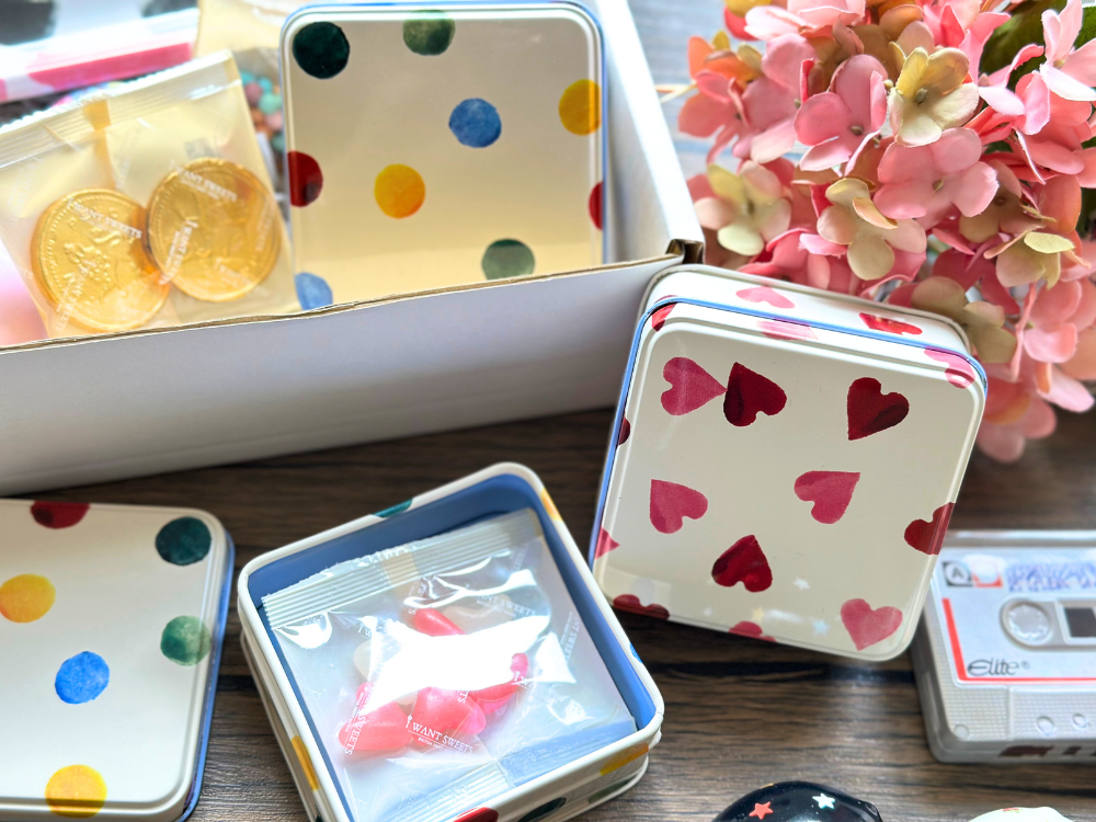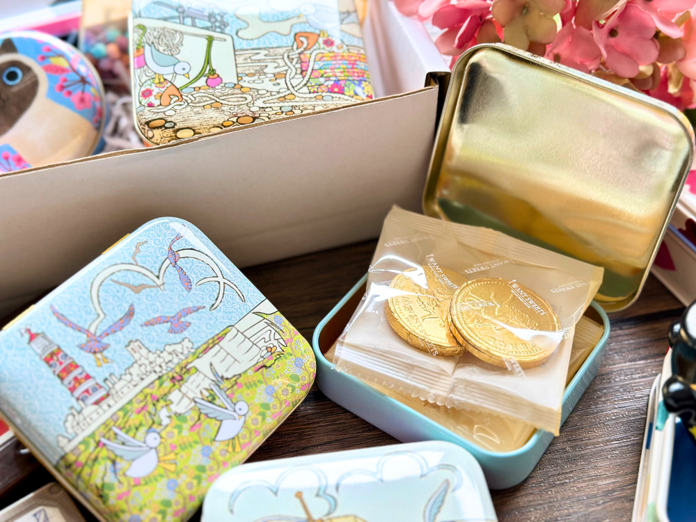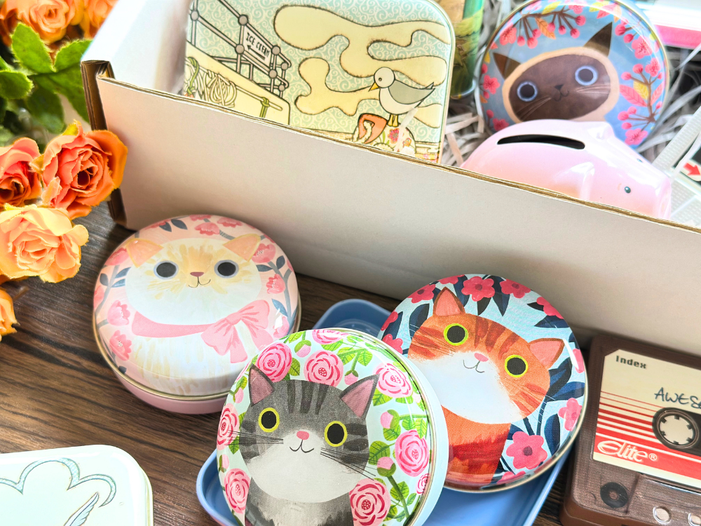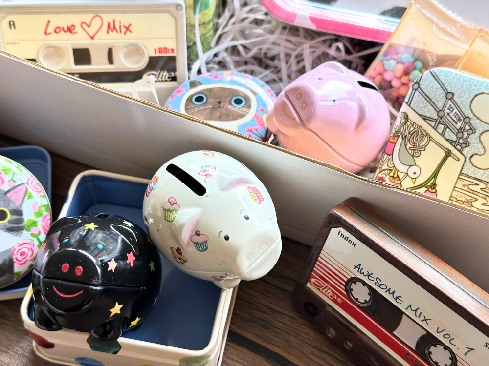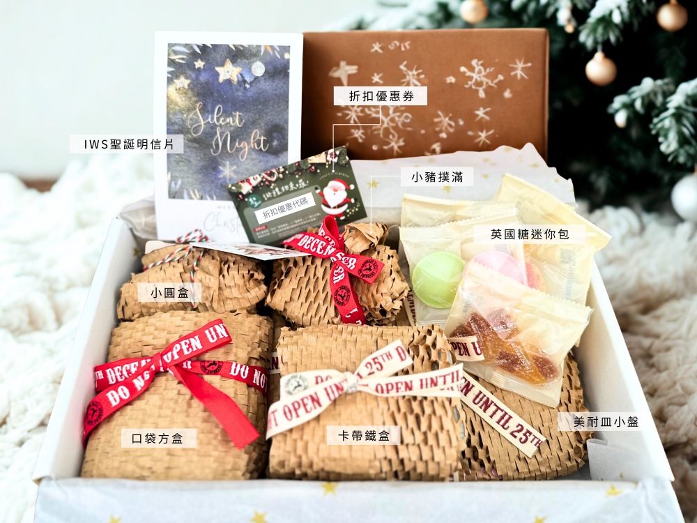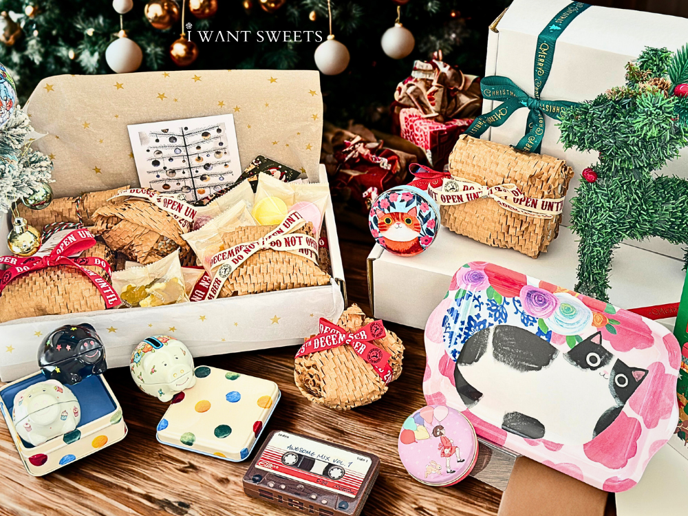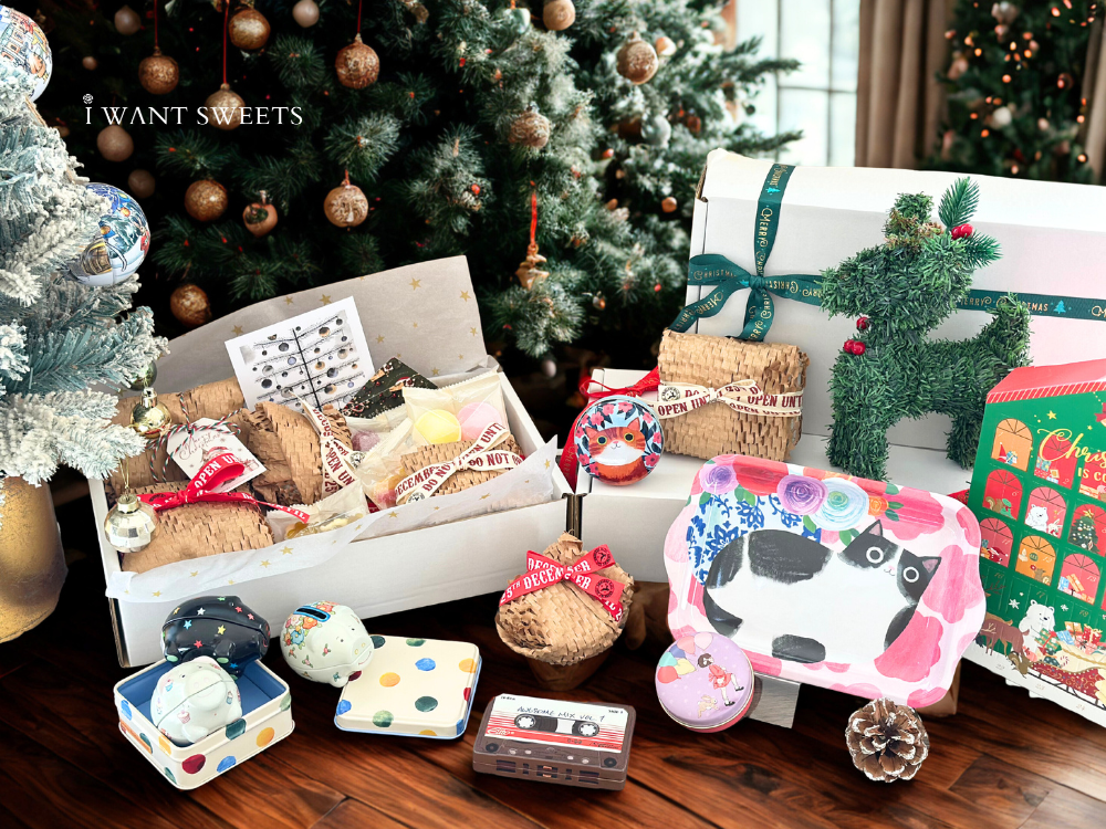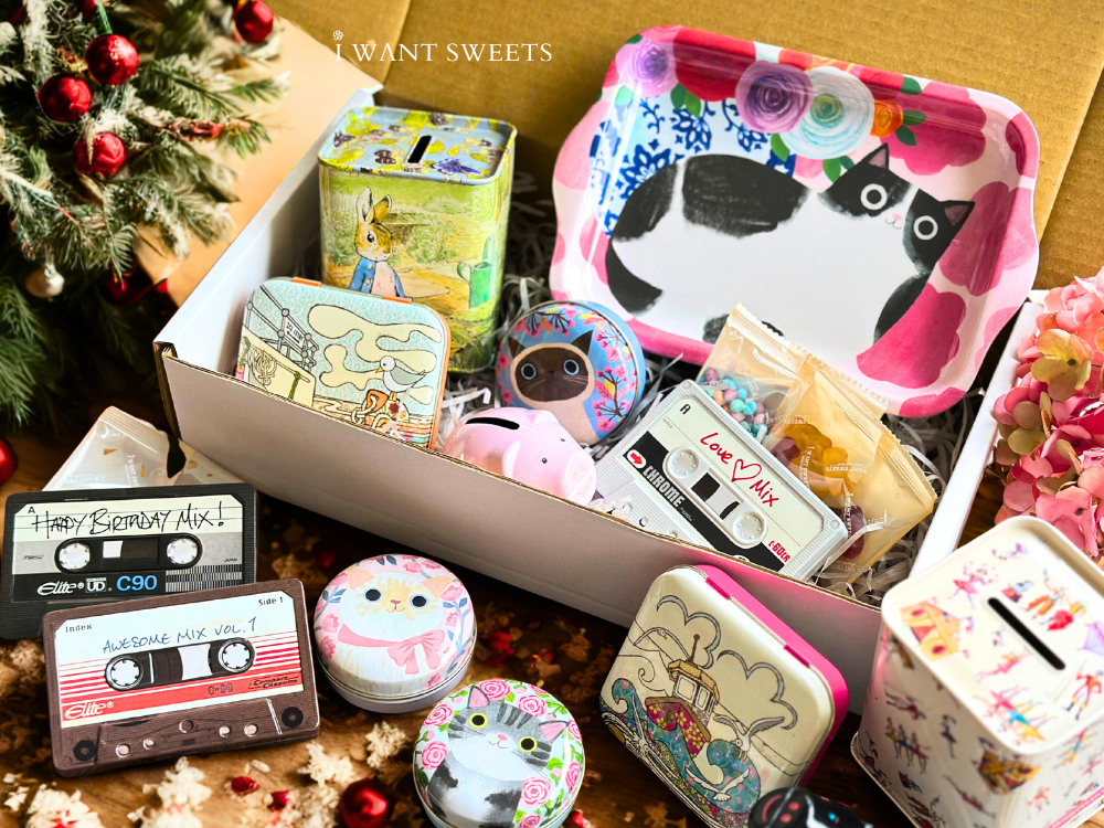 聖誕限定盲盒概念,內含小盤子、口袋方盒、小豬撲滿、小圓盒、卡帶鐵盒等不挑款隨機好物。每箱都是獨一無二的驚喜開箱,讓節日多一份期待與幸運!